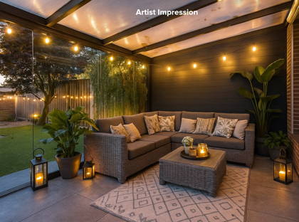 Buiten is de tuin onderhoudsvriendelijk aangelegd en dankzij de serre kun je hier in alle seizoenen van het buitenleven genieten.