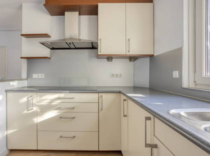 De keuken bevindt zich aan de voorzijde en is praktisch ingericht met diverse kastruimte en inbouwapparatuur, waaronder een grote inductiekookplaat.