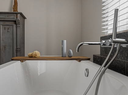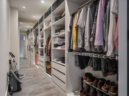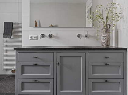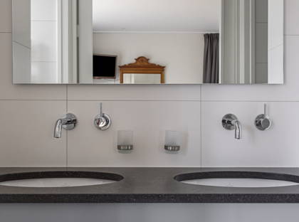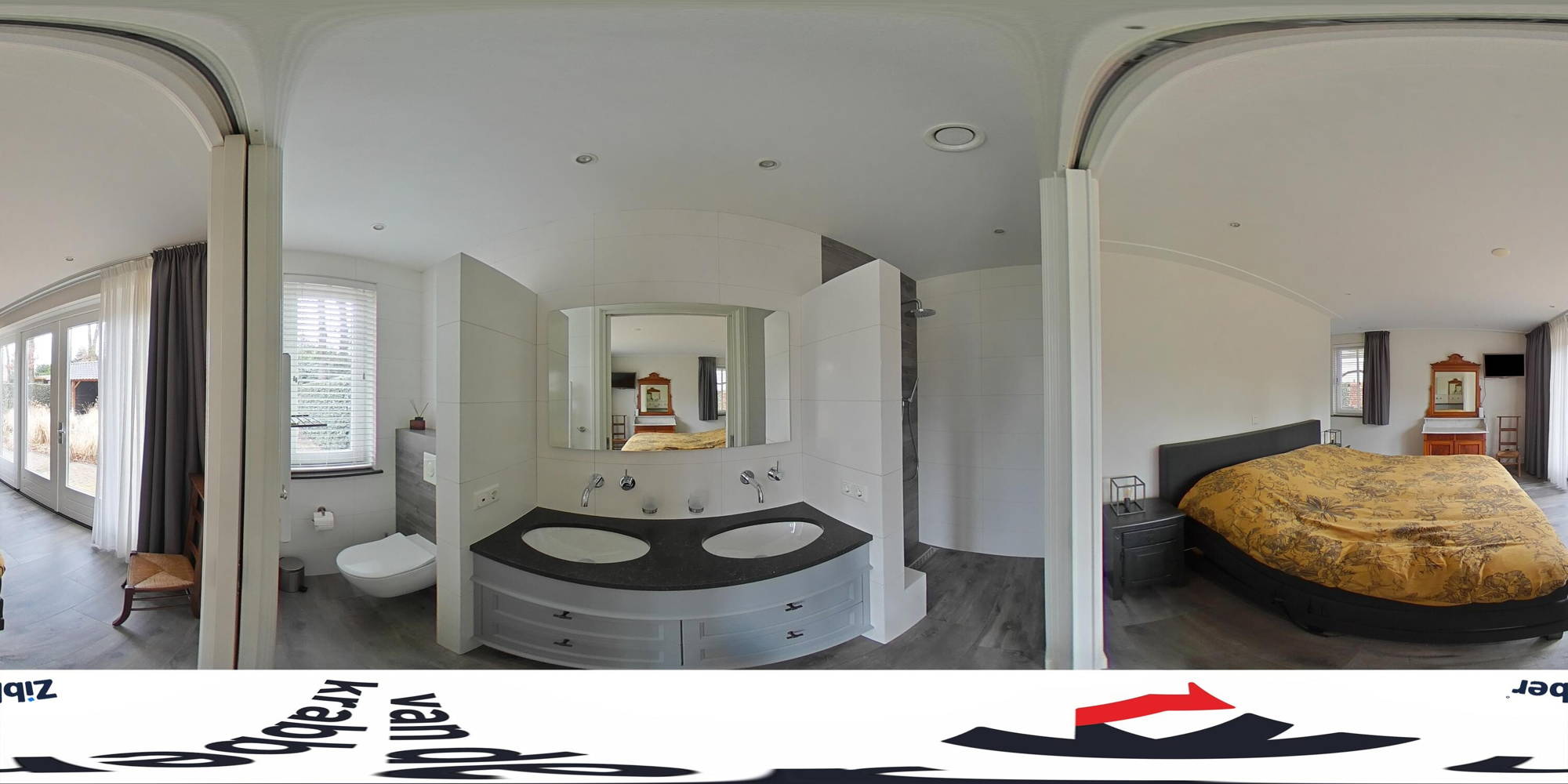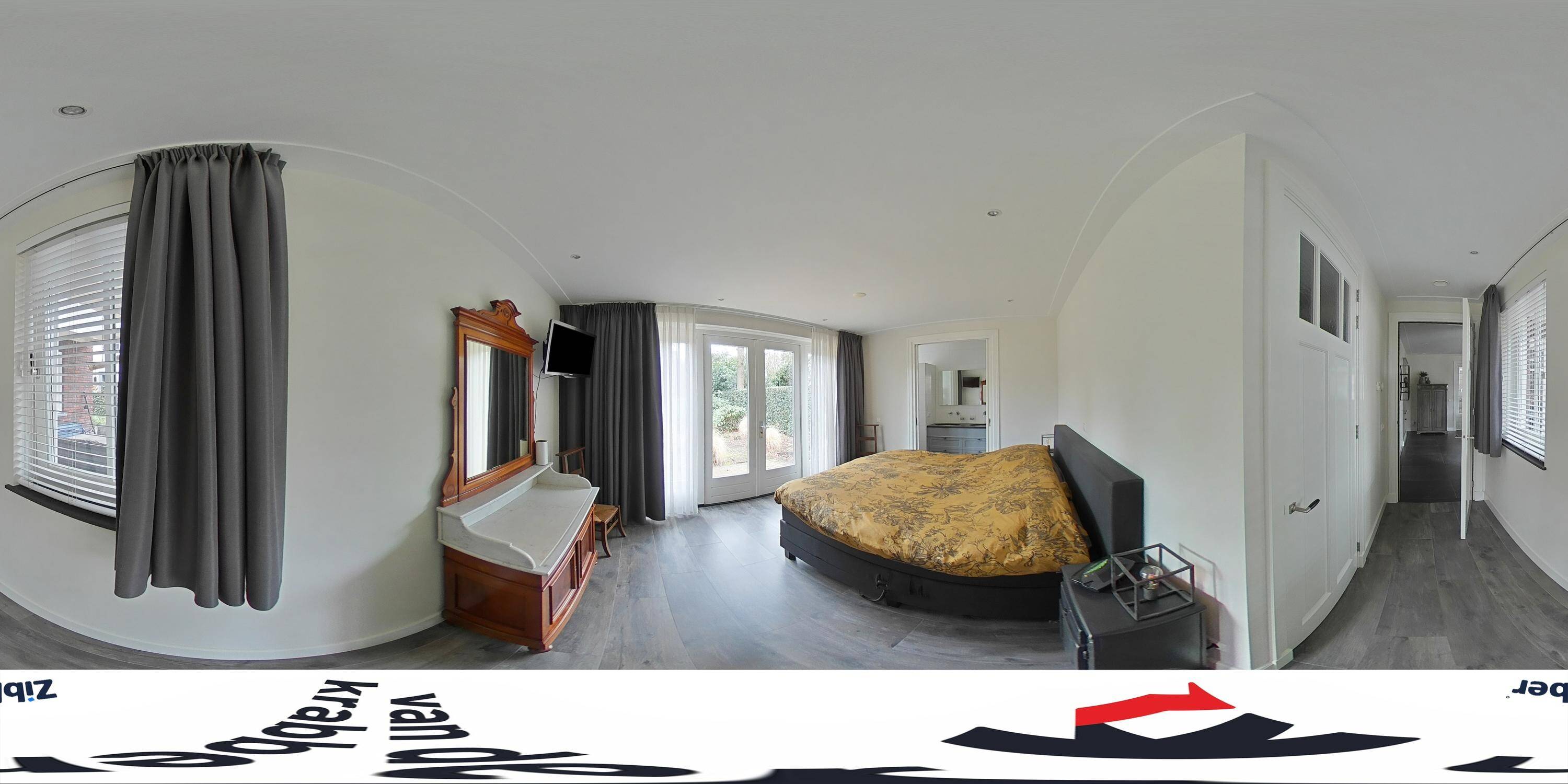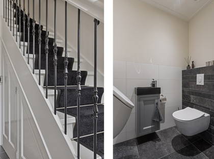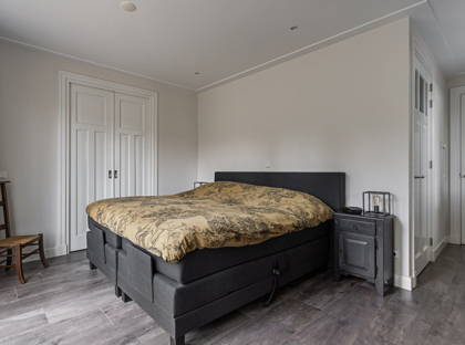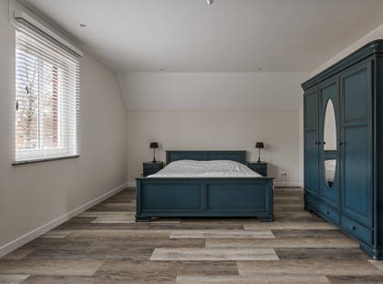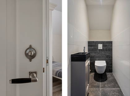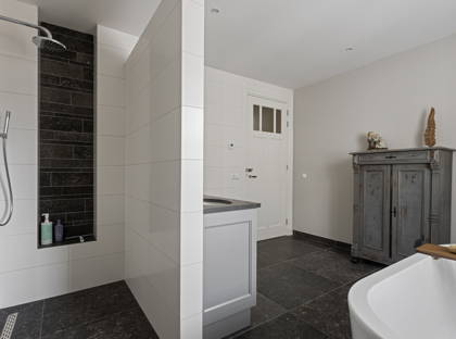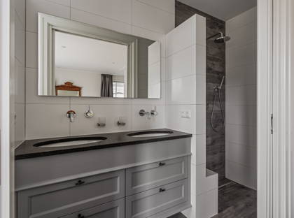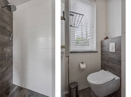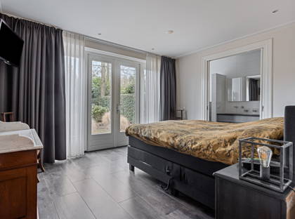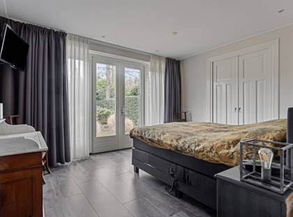 Achter de keuken wacht de volgende verrassing: een slaapkamer met inloopkast en badkamer op de begane grond. Dit maakt de woning levensloopbestendig en dus een heerlijk huis om lange tijd te blijven wonen. Deze slaapkamer kan ook perfect dienstdoen als thuiskantoor of speelkamer. De aangrenzende modern afgewerkte badkamer is voorzien van een inloopregendouche, dubbele wastafel en toilet.