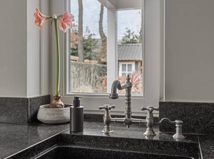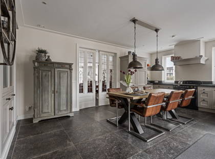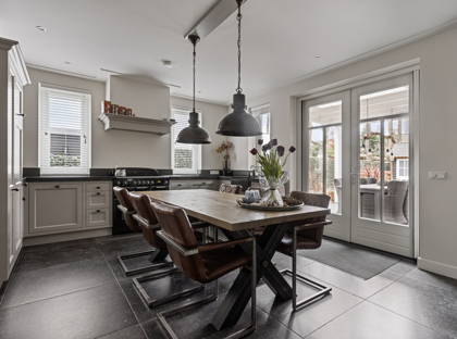 De karakteristieke en-suitedeuren brengen je vervolgens naar de fraaie keuken, die van alle moderne gemakken voorzien is. Met het prachtige Falcon fornuis met inductiekookplaat en meerdere ovens, kun je de lekkerste gerechten bereiden. Verder is de keuken voorzien van een afzuigkap, inbouwkoelkast en vaatwasser. Ook vind je er bijzonder veel aanrecht- en kastruimte. Met een ruime eettafel maak je van deze keuken een echte leefkeuken, met ruimte voor de hele familie. Aangrenzend aan de keuken is nog een hal met een toilet en aparte was- en bergruimte.