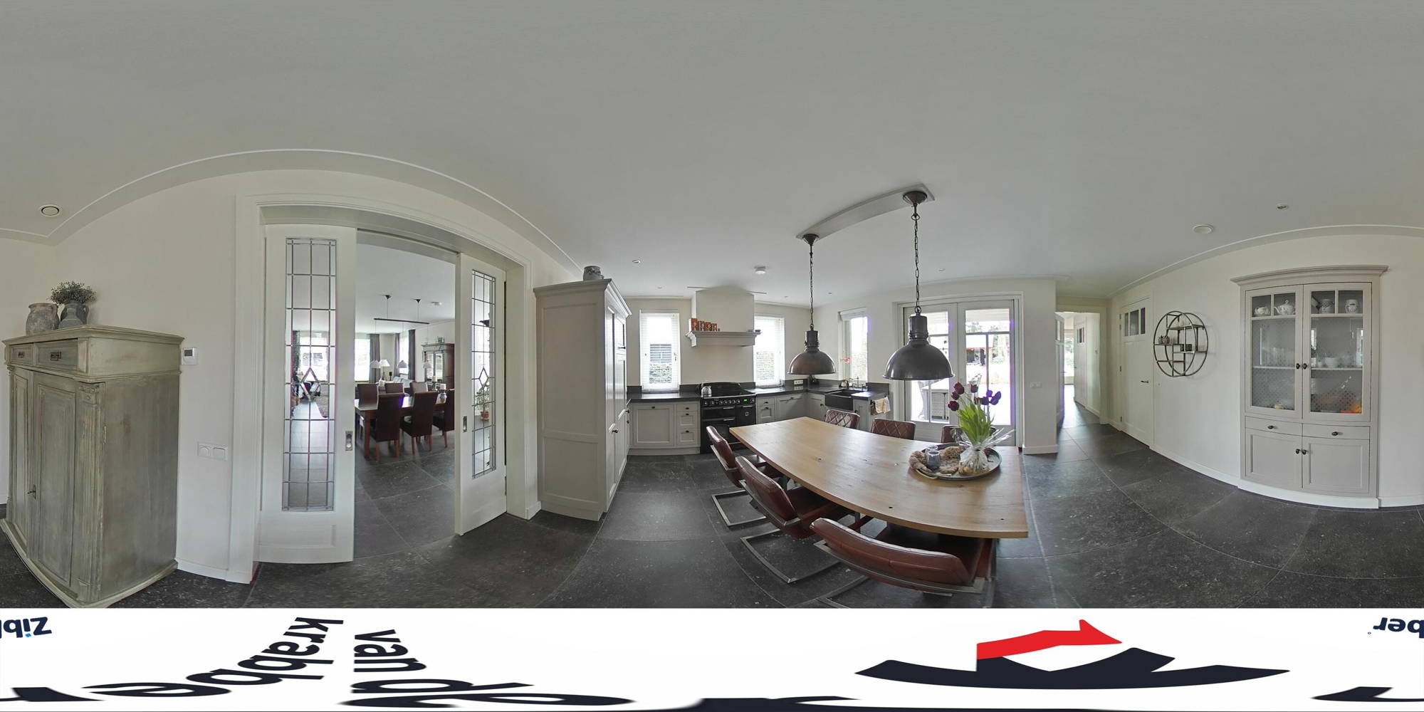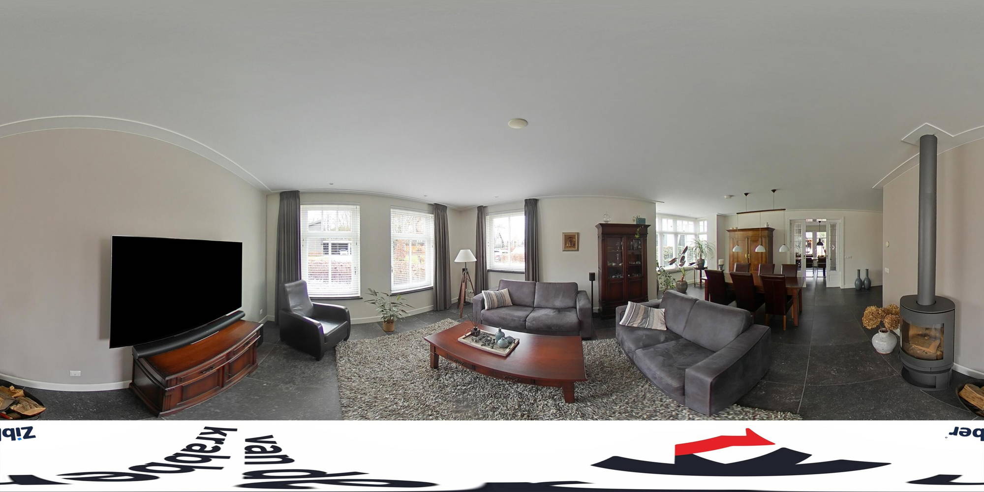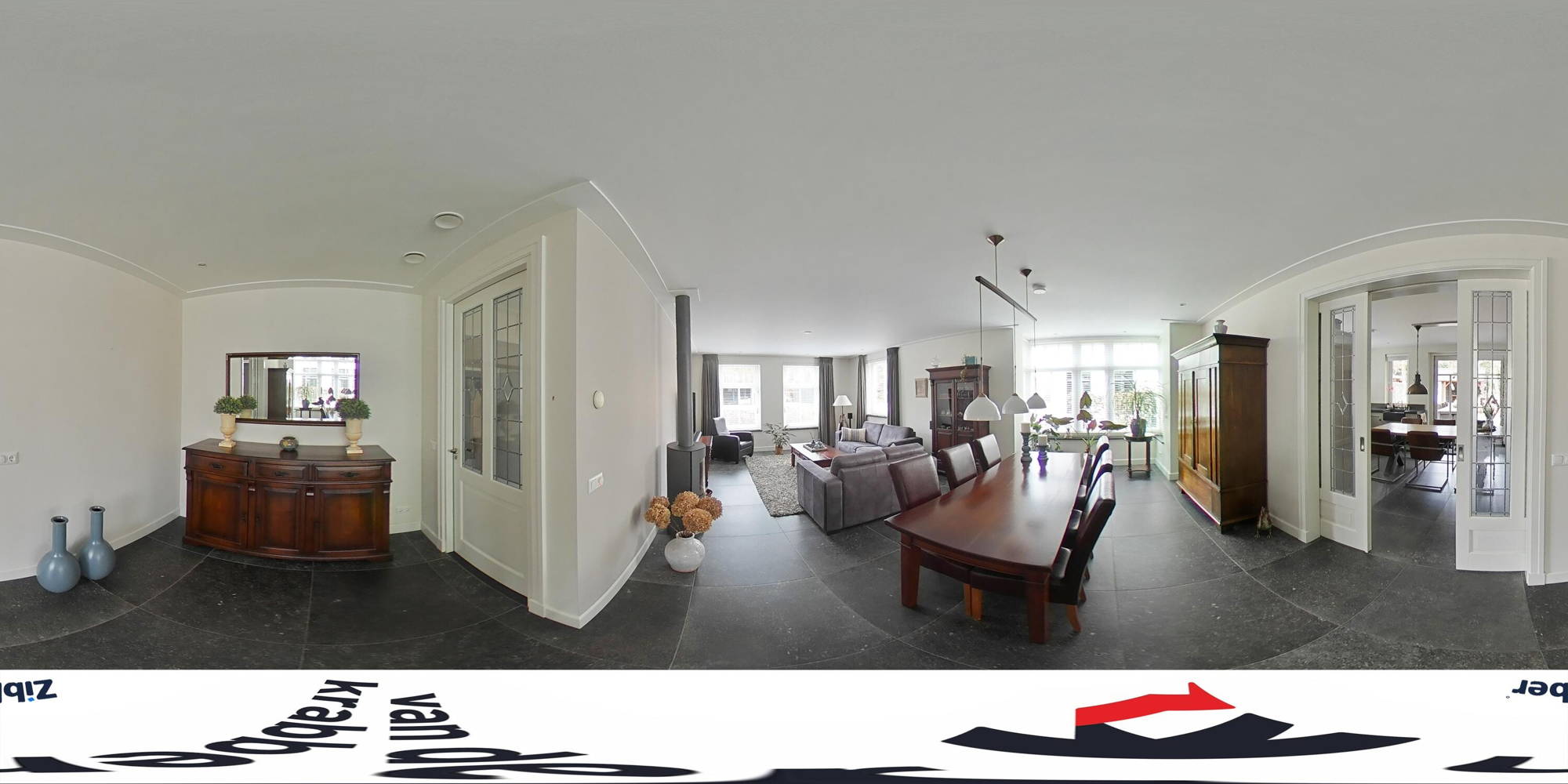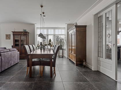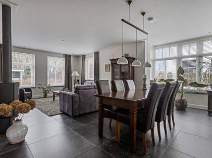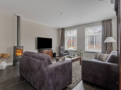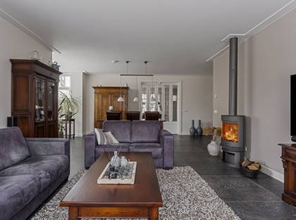 Via je eigen oprit, met ruimte voor drie auto’s, heb je toegang tot een grote garage met bergzolder. Hier is meer dan genoeg ruimte voor een auto, fietsen, motoren of het opbergen van gereedschap. Vanuit de ruime entree kom je in de woonkamer, voorzien van een moderne tegelvloer met vloerverwarming. Door de vele raampartijen is hier veel natuurlijke lichtinval. De erker is voorzien van ingebouwde elektrische screens. In de gezellige zithoek staat een houtkachel die zorgt dat je er in de koude wintermaanden warmpjes bij zit. In de woonkamer is bovendien ruimte voor een grote eettafel; perfect voor etentjes met vrienden of familie.