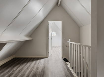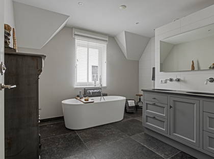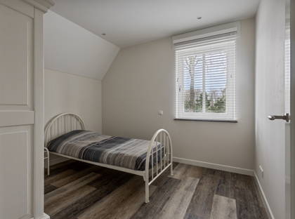 Op de eerste verdieping vind je drie slaapkamers, waarvan de master bedroom bijzonder ruim is. De luxe en riante badkamer is uitgerust met een groot meubel met dubbele wastafel, een ruime inloopdouche en een vrijstaand bad. Ook is er een apart toilet op de eerste verdieping. De ramen op deze verdieping zijn voorzien van ingebouwde elektrische rolluiken. Op de zolderverdieping vind je een overloop, ruime bergruimte en nog een kamer die bij uitstek geschikt is als extra slaap-, sport- of hobbykamer.