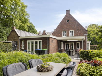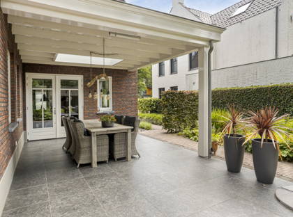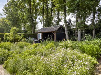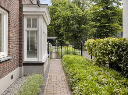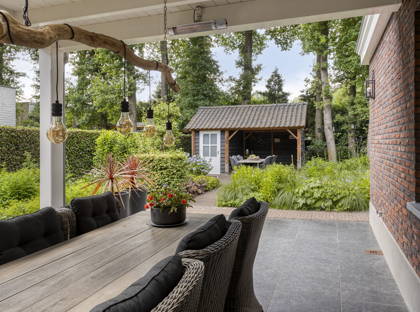Via de keuken en de slaapkamer op de begane grond, stap je door de openslaande deuren zo de fraaie tuin in. De ruime overkapping aan het huis is de perfecte plek om het hele jaar buiten te zitten. In de mooi aangelegde tuin geniet je van veel groen en privacy. Er is hier een volautomatische regeninstallatie aanwezig. Achter in de tuin staat een berging voor fietsen en (tuin)gereedschap, met aangrenzend een overkapping met nog een fijne zitplek.