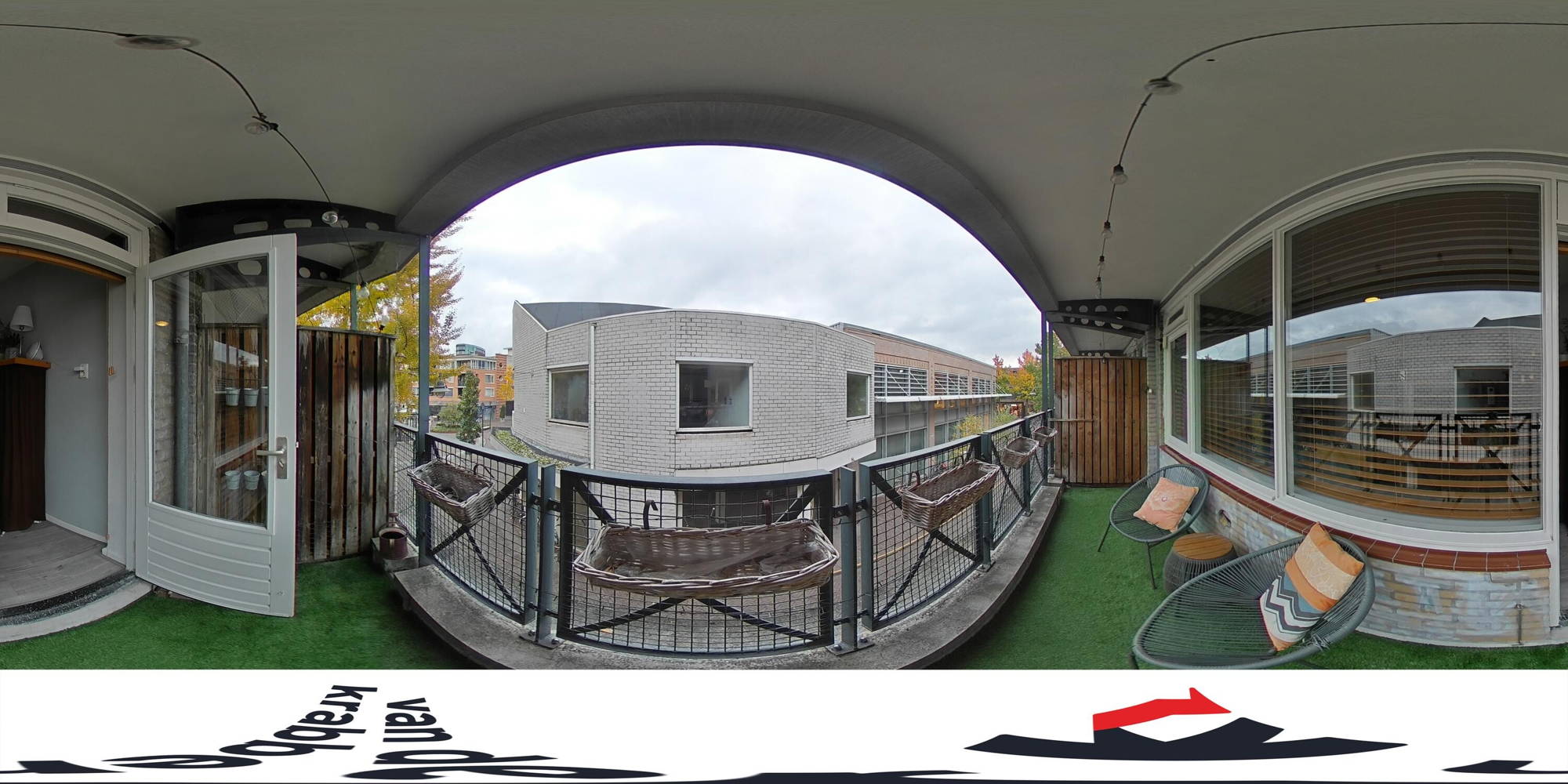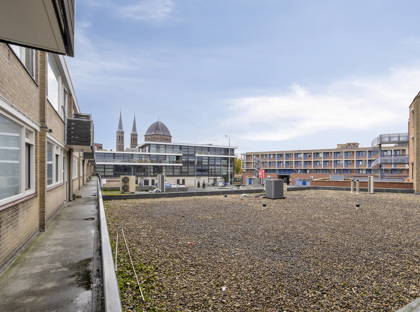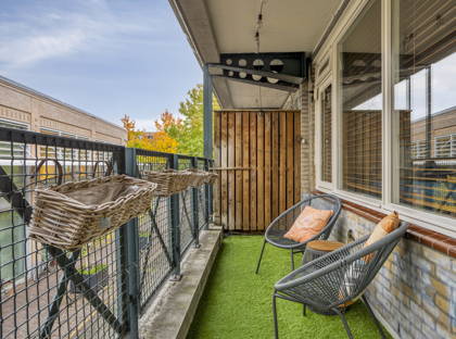 Via de balkondeur stap je het overdekte balkon op. Dit is een fijne plek om even buiten te zitten met uitzicht op het plein. Dankzij de ligging geniet je hier van de levendigheid van het centrum, terwijl je toch beschut zit.