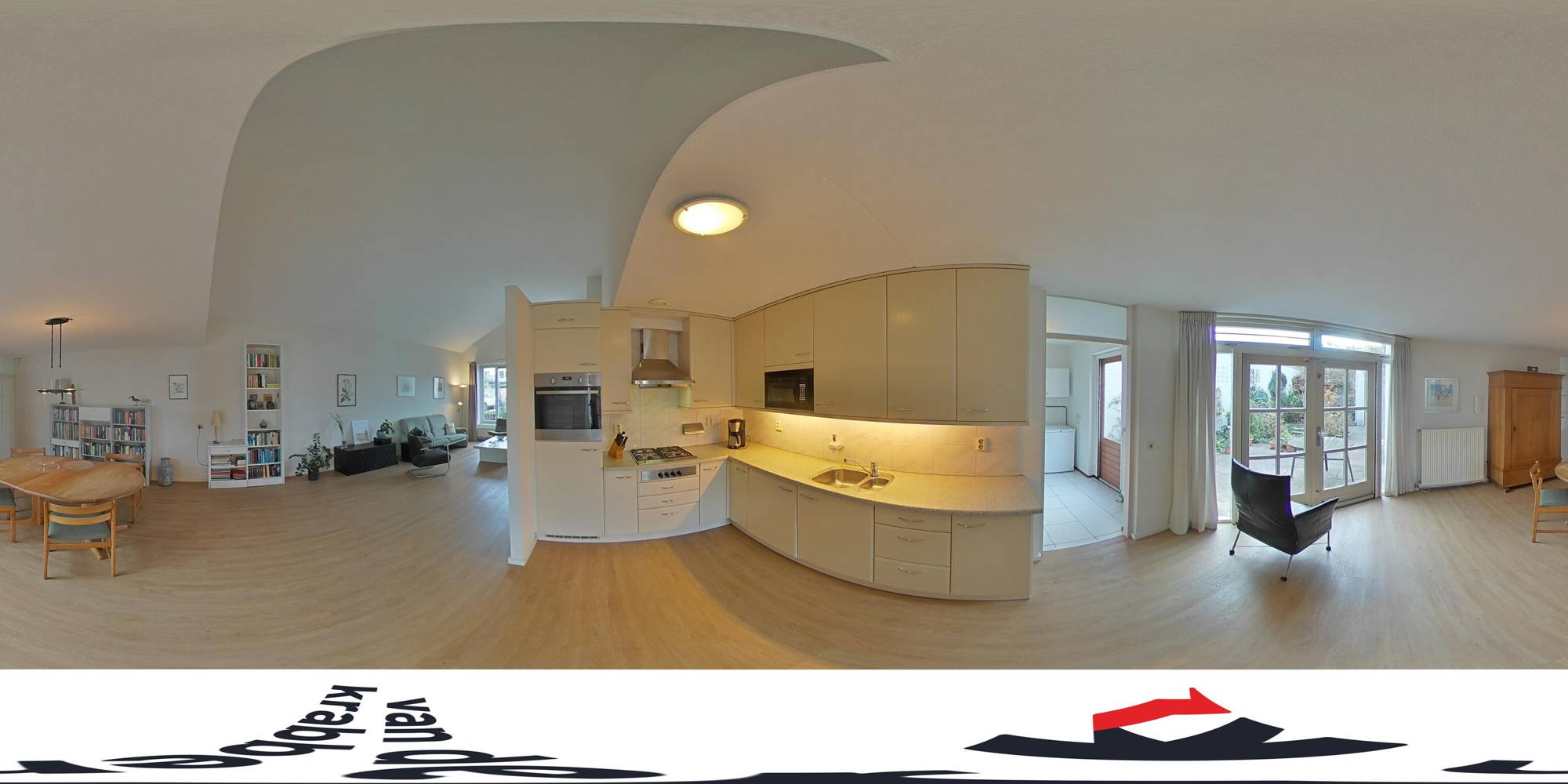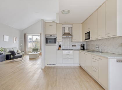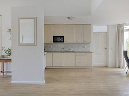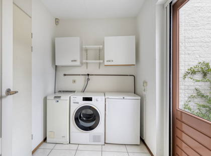 Verder naar achter in de woning gaat de woonkamer naadloos over in de leefkeuken. Hier is meer dan genoeg ruimte voor een grote eettafel, om zo een gezellige ontmoetingsplek te creëren voor vrienden en familie. De L-vormige keuken biedt veel kast- en aanrechtruimte en is uitgerust met een gasfornuis, afzuigkap, magnetron, oven, koelkast en vaatwasser. Naast de keuken is nog een bijkeuken: ideaal voor extra bergruimte en bijvoorbeeld een grote vriezer.