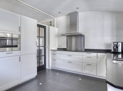 Aan de achterzijde ligt de ruime leefkeuken met donkere tegelvloer, volop kastruimte en moderne inbouwapparatuur zoals een inductiekookplaat, oven, koel-vriescombinatie en afzuigkap. Openslaande deuren leiden naar de zonnige, fraai aangelegde tuin.