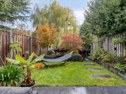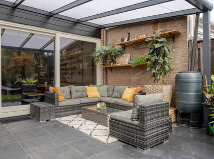 Dan nog even over de achtertuin… wat een fijne plek! Direct aan de woonkamer vind je een overkapping voor het hele jaar door genieten. Het gazon, groen en de plantenbakken geven sfeer, en via een trapje bereik je het lager gelegen gedeelte met vijver en tuinhuis. Dankzij de ligging aan een kindvriendelijk erf én het water achter de tuin woon je hier heerlijk rustig en vrij.