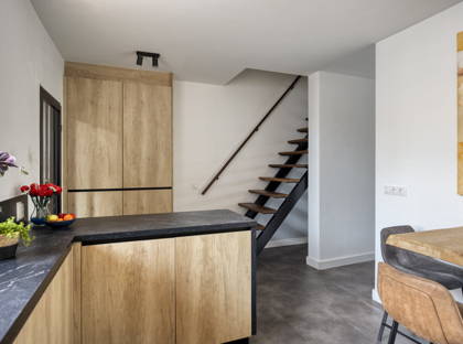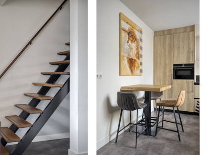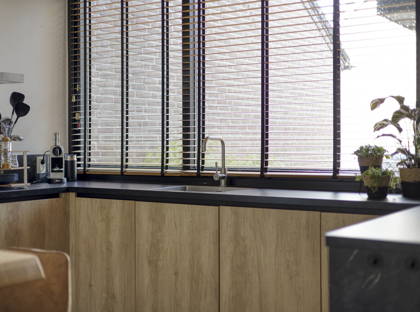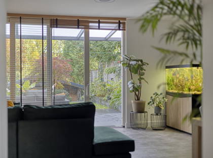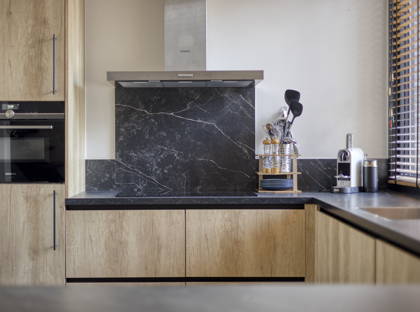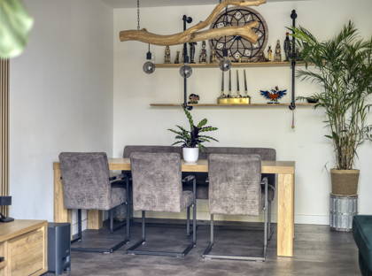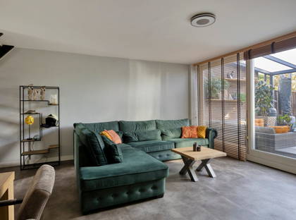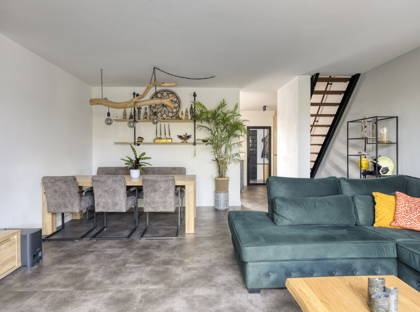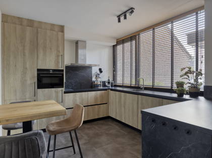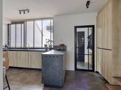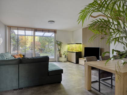 De lichte, sfeervolle woonkamer staat door de grote schuifpui mooi in verbinding met de tuin. De pvc-vloer met vloerverwarming biedt veel comfort en zorgt voor een moderne uitstraling. Aan de voorzijde bevindt zich de vernieuwde keuken (2021): een stijlvol en praktisch U-opgesteld ontwerp met alle gewenste inbouwapparatuur, waaronder inductiekookplaat, combi-oven en vaatwasser.