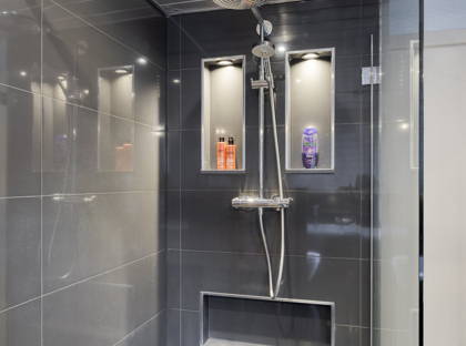 • Ruime badkamer met ligbad, inloopdouche en toilet