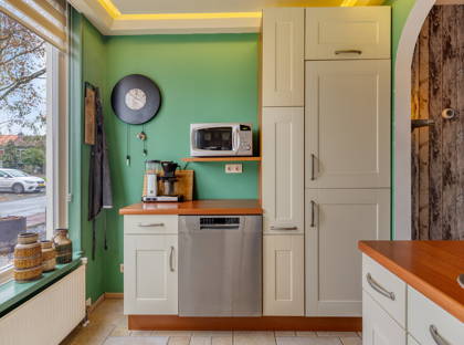 • Complete keuken met o.a. gasfornuis, afzuigkap, oven, koelkast, vriezer en vaatwasser