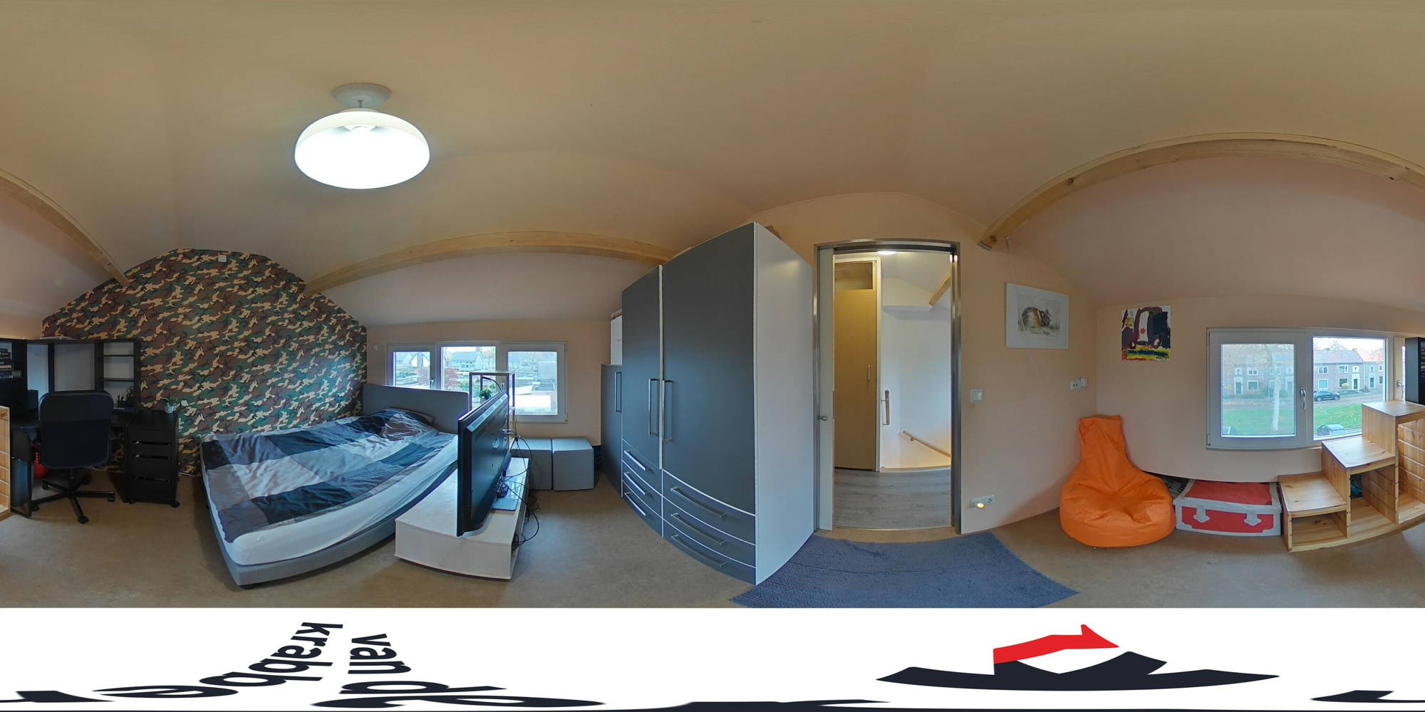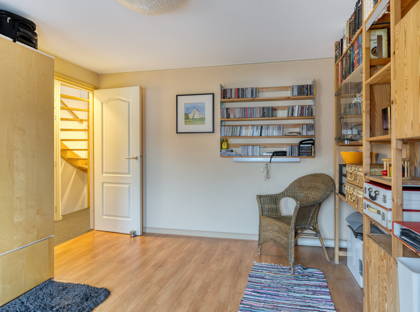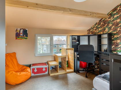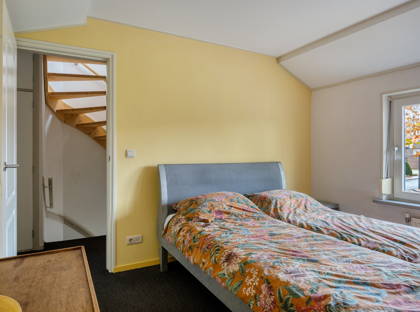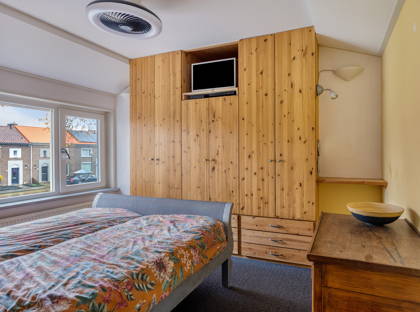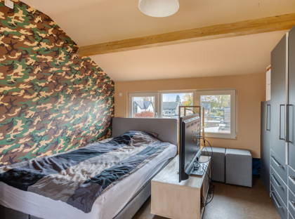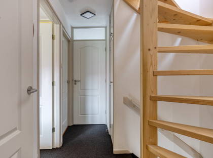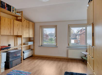 De tweede verdieping verrast met nog een ruime slaapkamer en een overloop, eveneens voorzien van rolluiken. Een perfecte plek voor bijvoorbeeld een thuiswerkplek, hobbykamer of logeerkamer.
