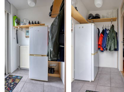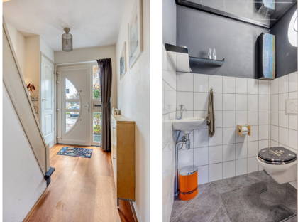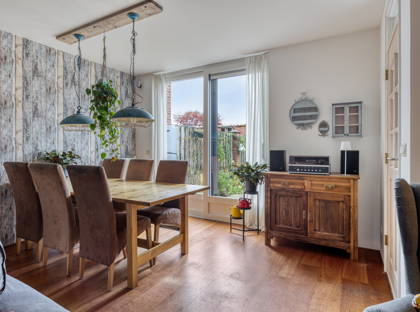 Je stapt binnen in de hal, waar je meteen de trapkast, meterkast en het toilet vindt. Vanuit hier loop je door naar de woonkamer, een lichte en ruime living met genoeg plek voor een gezellige zithoek én een grote eettafel. De schuifdeuren naar de achtertuin zorgen niet alleen voor veel daglicht, maar ook voor een prettige verbinding met buiten.
