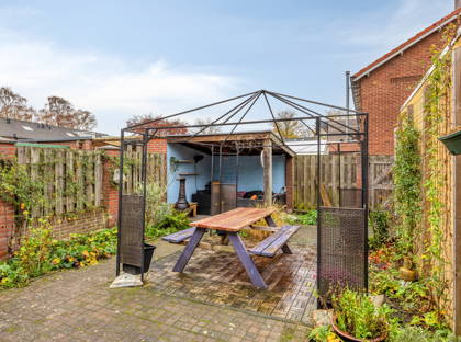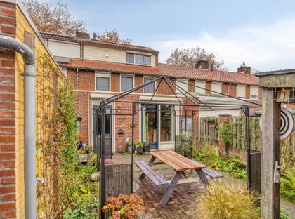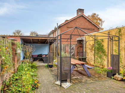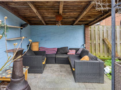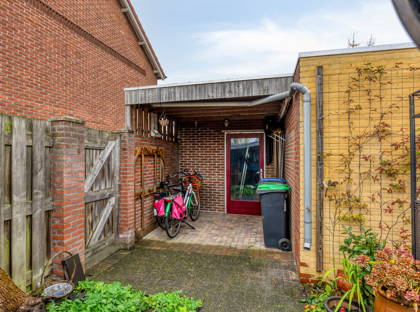 De achtertuin is onderhoudsvriendelijk aangelegd en biedt veel ruimte. Achterin vind je een fijne overkapping waar je tot laat in de avond kunt zitten. Daarnaast is er een berging met een aangebouwde overkapping en via de brandgang is er een handige achterom.