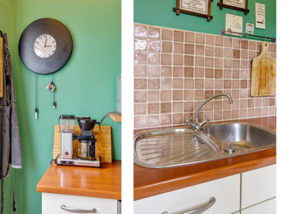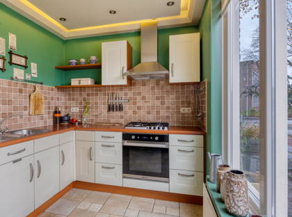De keuken ligt aan de voorzijde van de woning en is compleet uitgerust met onder andere een gasfornuis, afzuigkap, oven, koelkast, vriezer en vaatwasser. Er is voldoende werk- en bergruimte.
