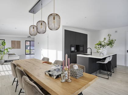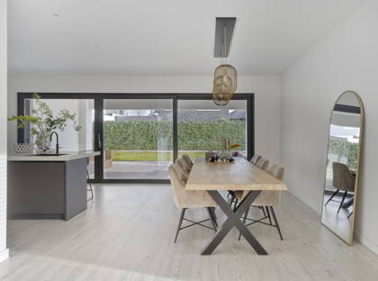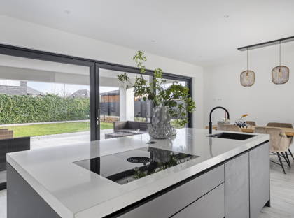 Aan de achterzijde van het huis ligt de grote open woonkeuken. Je kunt hier met gemak een tafel voor acht of tien personen kwijt; dé garantie voor lange avonden tafelen met familie of vrienden. De zeer moderne keuken met kookeiland is werkelijk van alle gemakken voorzien: een Quooker, inductiekookplaat met ingebouwde afzuiging, combi-oven, oven, vaatwasser en koel-vriescombinatie. Koken doe je hier met uitzicht op de heerlijke tuin! En dankzij het barretje in de keuken kunnen gezinsleden gezellig aanschuiven.