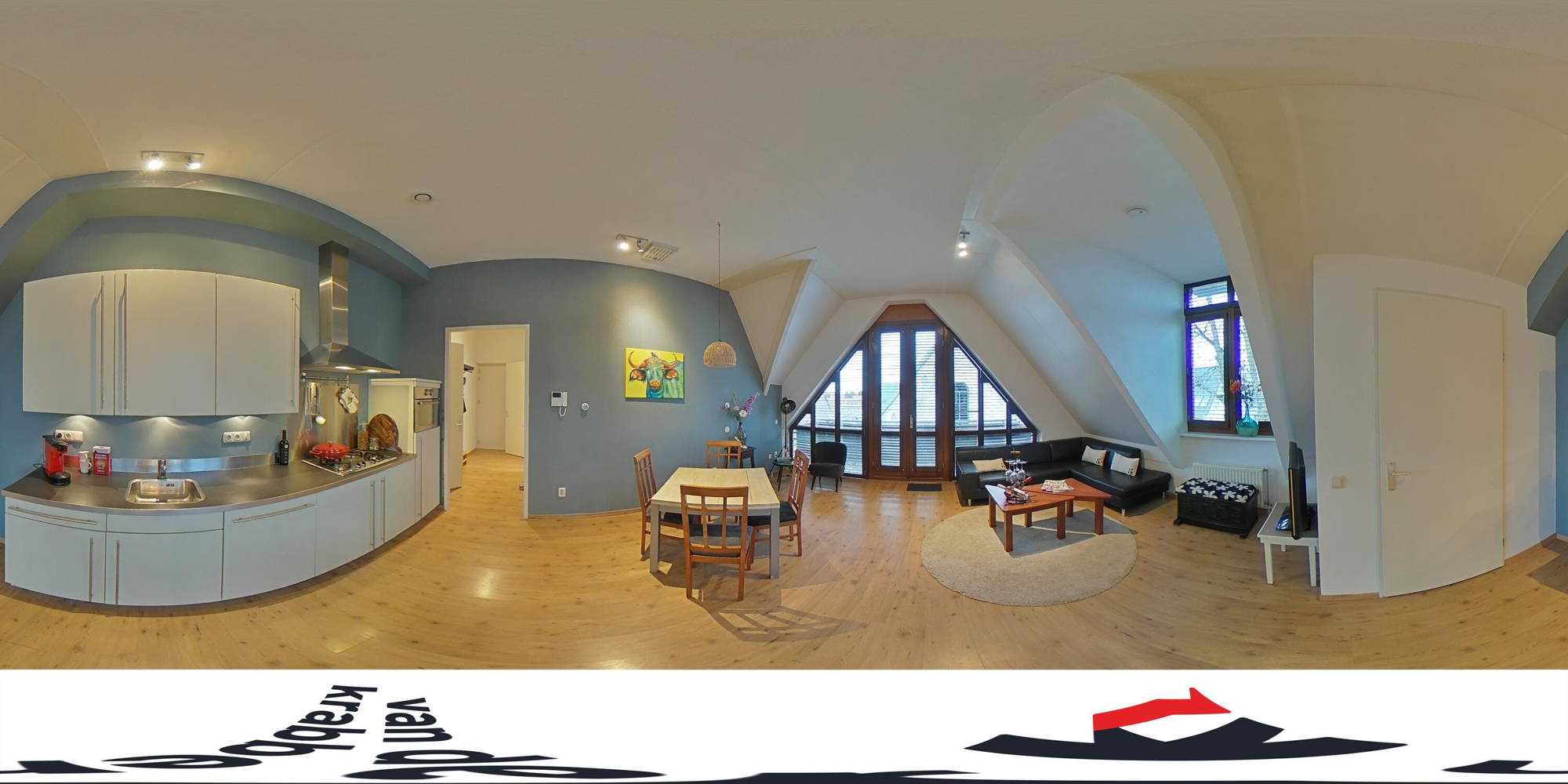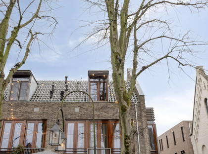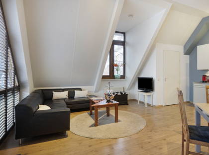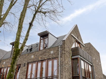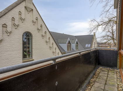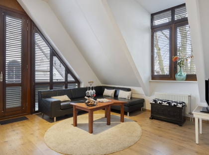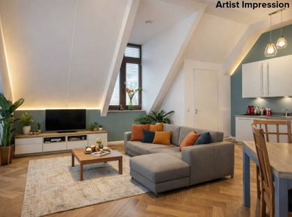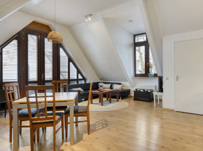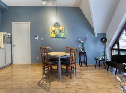 Bij binnenkomst valt meteen de prettige lichtinval op. De woonkamer is ruim en speels van opzet dankzij de schuine daklijnen, wat zorgt voor een warm en karaktervol geheel. Hier is meer dan genoeg ruimte voor een comfortabele zithoek én een eettafel. Via de openslaande deuren stap je zo het balkon op: een fijne plek om even buiten te zitten en te genieten van het uitzicht over de karakteristieke bebouwing in de straat.
