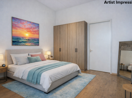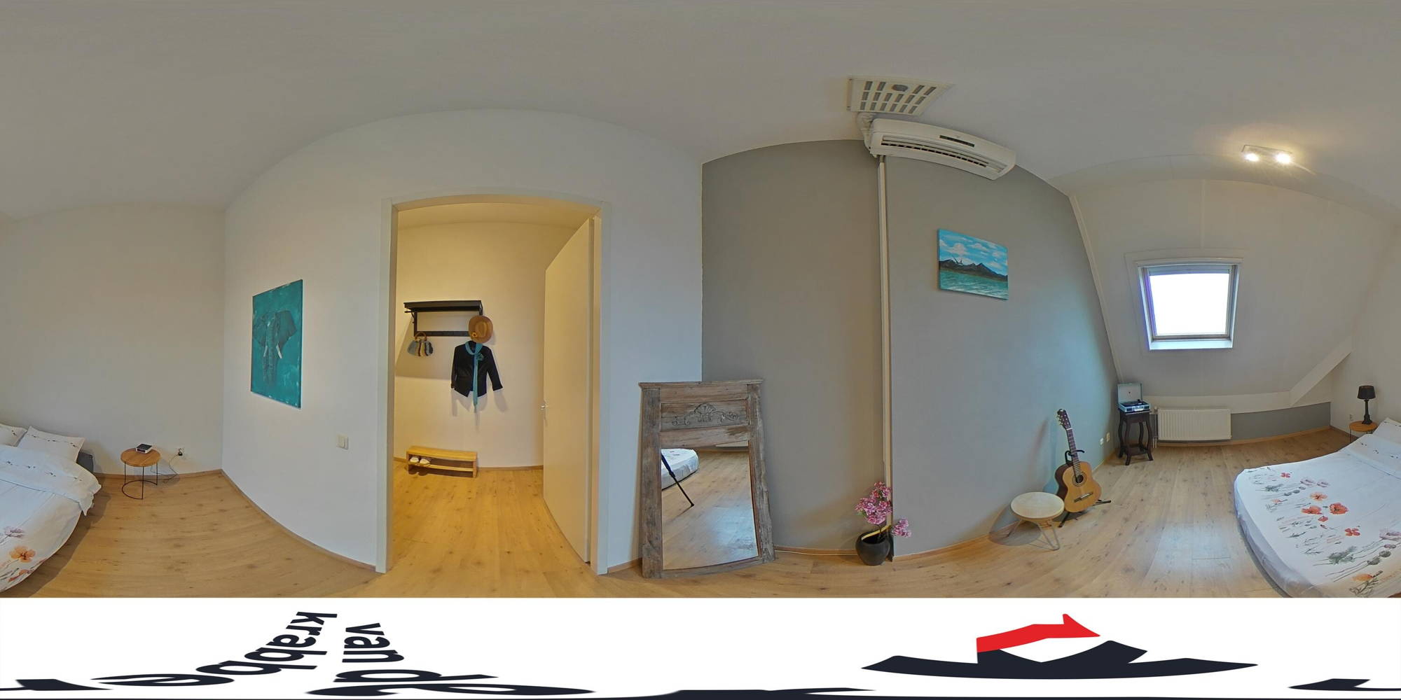 Het appartement heeft een ruime slaapkamer met voldoende plek voor een tweepersoonsbed en kastruimte. Ook hier zorgen de daklijnen voor sfeer, zonder dat het ten koste gaat van het comfort. De badkamer is netjes en compleet uitgevoerd met een douche, wastafelmeubel en toilet.