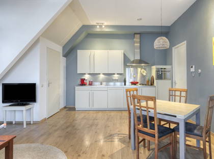 • Open keuken met gasfornuis, afzuigkap, combimagnetron, koelkast en vaatwasser