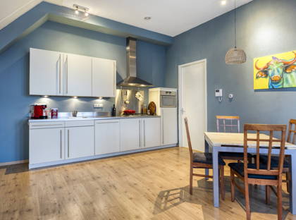 De open keuken sluit mooi aan op de woonkamer en is praktisch ingericht. Je beschikt hier over een gasfornuis, afzuigkap, combimagnetron, koelkast en vaatwasser. Of je nu uitgebreid wilt koken of snel iets op tafel zet, alles is binnen handbereik.