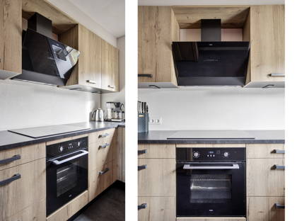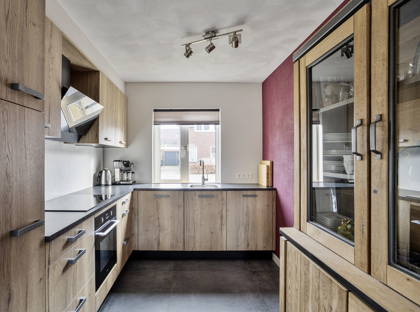 De keuken is gelegen aan de voorzijde van het huis en is ook slechts enkele jaren oud. Door de slimme combinatie van kasten en lades in houtlook en een donker aanrechtblad, is de keuken sfeervol en tijdloos. De keuken is compleet uitgerust met een inductiekookplaat, afzuigkap, vaatwasser, een grote oven en koelkast. Dankzij de vele kastruimte en het grote aanrechtblad is het een fijne praktische keuken om in te koken.