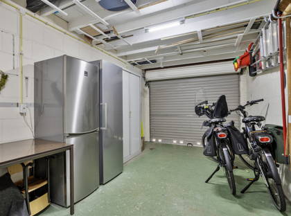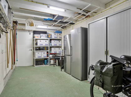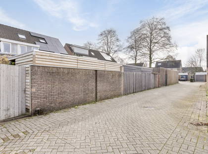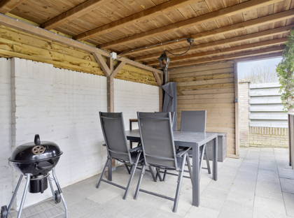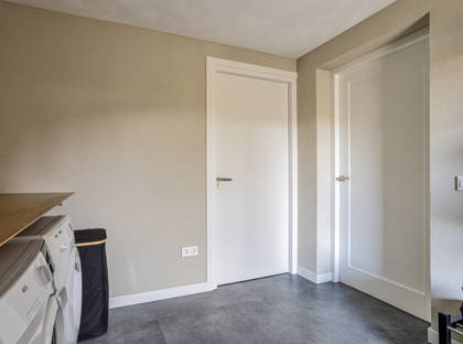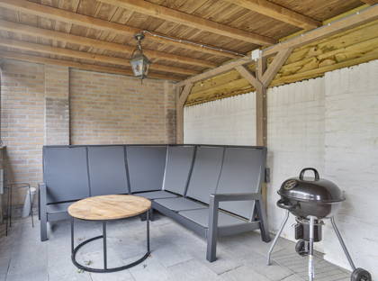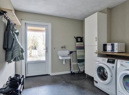 Naast de woonkamer is de bijkeuken; een praktische ruimte met een wasbak, opbergruimte en de aansluiting voor de wasmachine en de droger. Vanuit hier heb je ook toegang tot de ruime garage – ideaal voor fietsen, motoren en andere spullen – en de achtertuin. De tuin is net onderhouden en onderhoudsvriendelijk aangelegd, met borders, kunstgras en diverse beplanting. Achter in de tuin is een grote overkapping over de volle breedte van de tuin, waar je met het hele gezin of met vrienden kunt genieten.