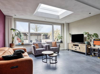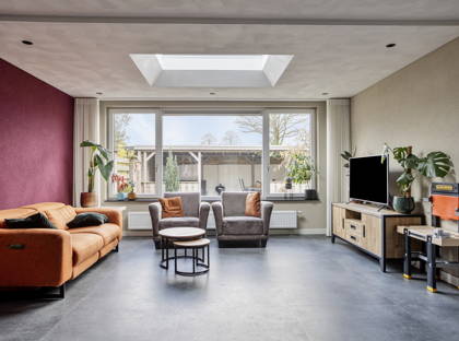 Door de uitbouw (ook uitgevoerd in 2023) is de woonkamer zeer ruim en heel veelzijdig in te delen. Er is ruimte voor een grote bank, een riante eettafel, een werkplek en een plek om speelgoed op te bergen. Met dank aan de lichtkoepel in de uitbouw geniet je van veel natuurlijke lichtinval in de woonkamer. Deze lichtkoepel is bovendien voorzien van een zonnescherm en kan eenvoudig op afstand worden geopend. Ideaal voor extra comfort in de zomer! Onder de trap is een ruime kast om voorraad en andere spullen op te bergen.