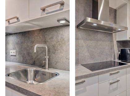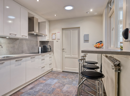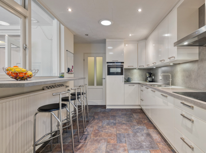De halfopen keuken is praktisch ingedeeld, met veel aanrecht- en kastruimte. Hier vind je een inductiekookplaat, afzuigkap, Quooker, vaatwasser, combimagnetron en koelkast. De bar in de keuken is ideaal om aan te ontbijten of voor een drankje tijdens het koken. Achter de keuken ligt een bijkeuken met aansluitingen voor de wasmachine en de droger. Vanuit hier heb je ook toegang tot de inpandige garage, die enorm veel bergruimte biedt.