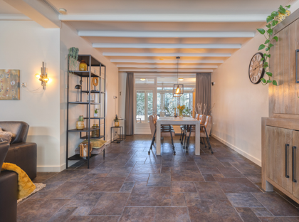 Via de riante oprit, met ruimte voor twee auto’s, heb je toegang tot de voordeur van het huis. De entree is ruim en biedt verschillende opbergmogelijkheden. Hier is ook het toilet gelegen. Vanuit de hal loop je door naar de L-vormige woonkamer. Deze is voorzien van een fraaie plavuizen vloer, met vloerverwarming. Behalve in de woonkamer is er ook vloerverwarming in de hal, keuken, het toilet en bijkeuken. Aan de voorzijde van de woning is ruimte voor een gezellige zithoek, met veel daglicht dankzij de vele ramen. Het tussenstuk tussen de woonkamer en de keuken is de perfecte plek voor een grote eettafel.