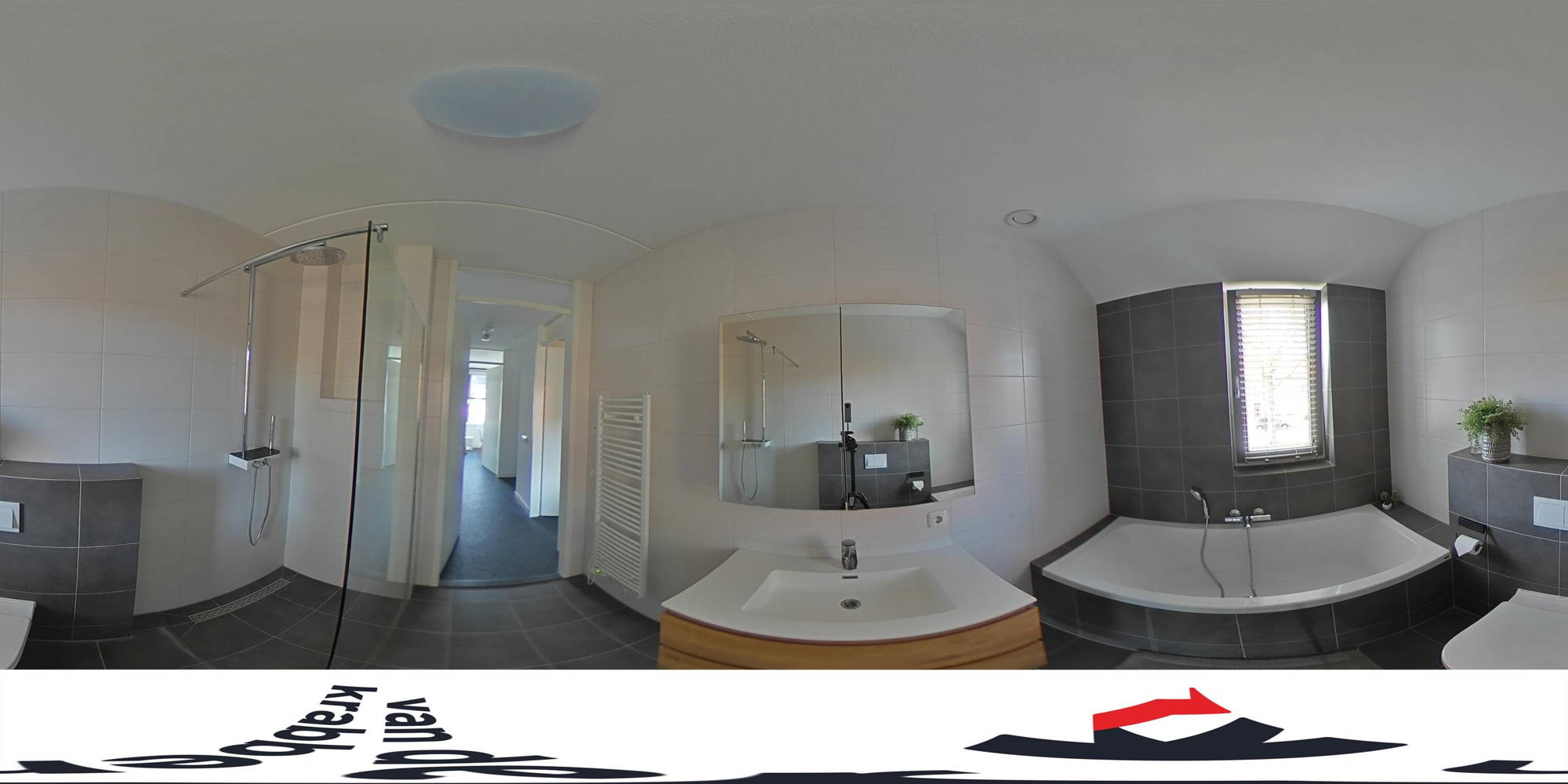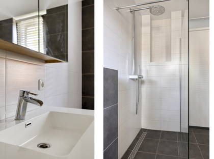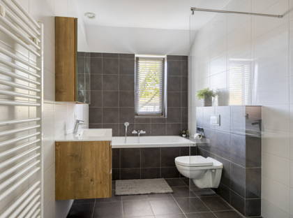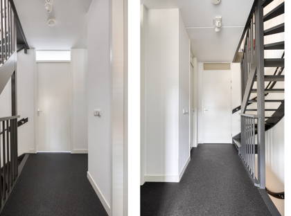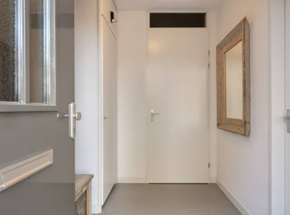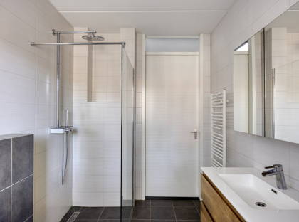 De trap naar de eerste verdieping zit in deze woning ‘verstopt’ achter een deur in de woonkamer. Een duurzame oplossing, want dit zorgt ervoor dat er geen warmte ontsnapt naar de bovenverdiepingen. Op de eerste verdieping zijn drie slaapkamers, allemaal licht en ruim. De moderne badkamer is fraai en compleet uitgevoerd met een ruim ligbad, een inloopregendouche, een wastafel en een toilet.
