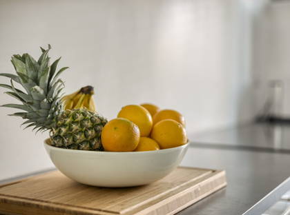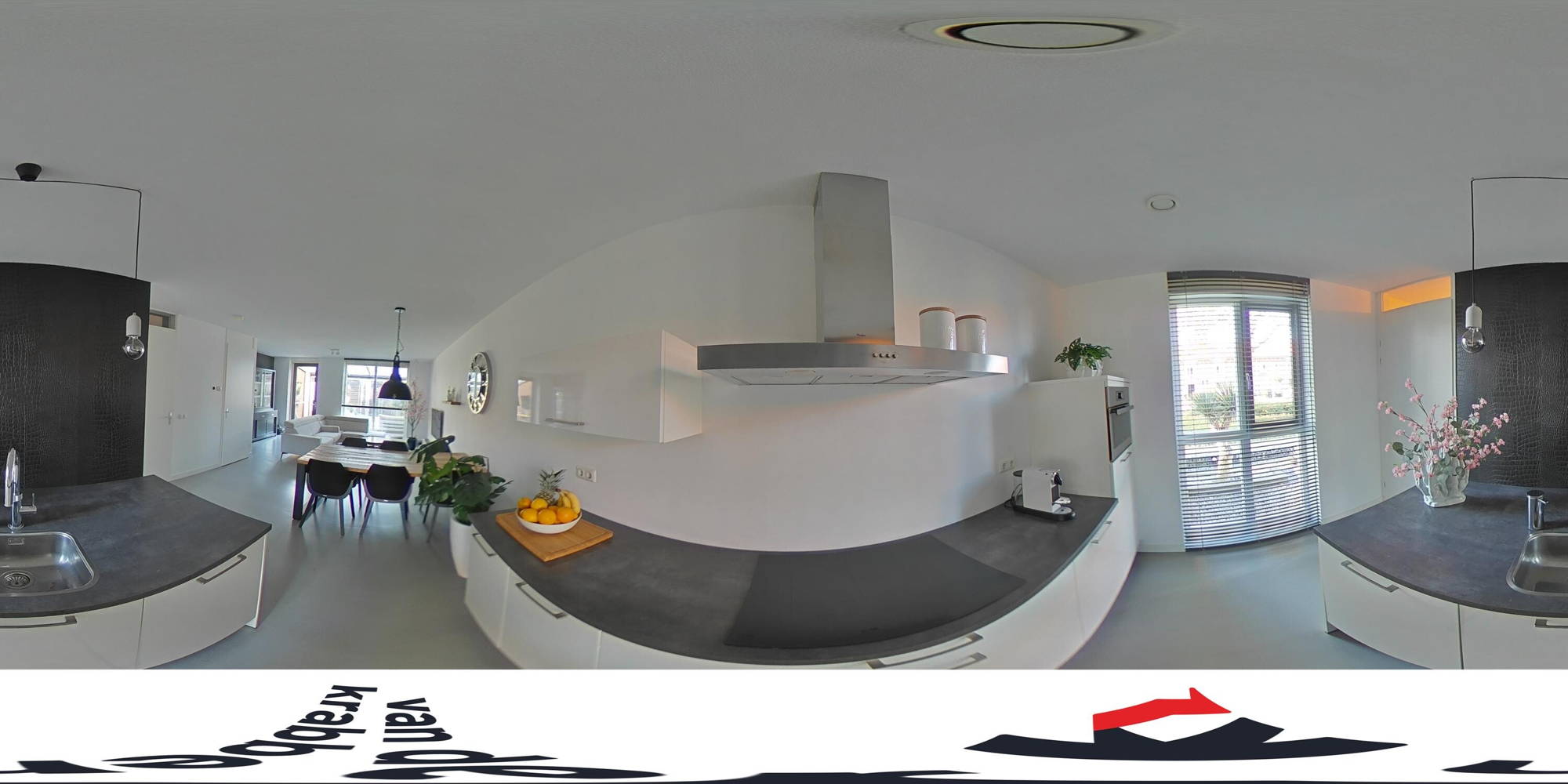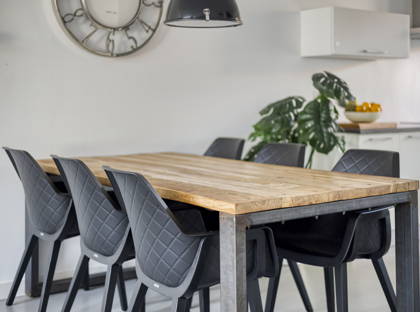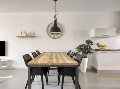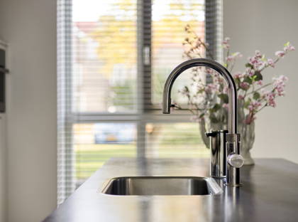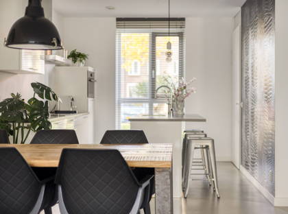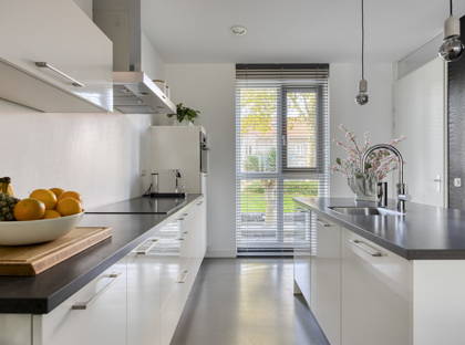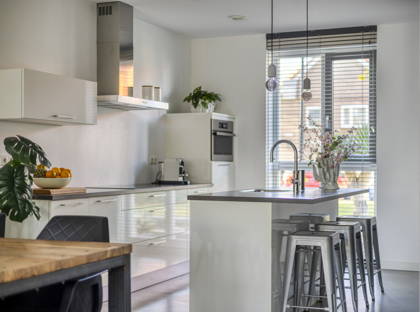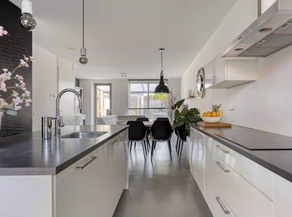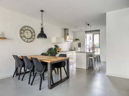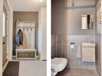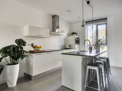 In de entree zie je direct een glimp van de strakke en onderhoudsvriendelijke gietvloer. Deze is doorgelegd op de hele benedenverdieping en is voorzien van vloerverwarming. In de hal vind je ook het moderne toilet. Achter de andere deur wacht de verrassing van dit huis: hier geen standaardkeuken, maar een speelse leefkeuken met kookeiland en ontbijtbar. De keuken is uitgerust met een Quooker, inductiekookplaat, afzuigkap, combi-oven, vaatwasser en koelkast. Dankzij het grote raam aan de voorzijde is de keuken bovendien heerlijk licht.