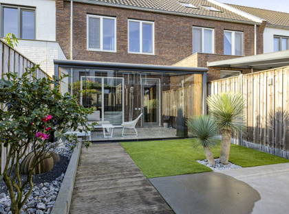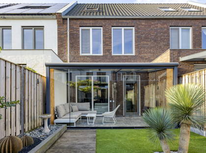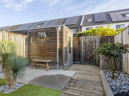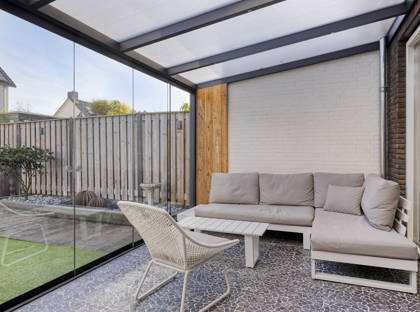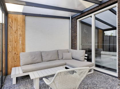 De volgende verrassing van deze woning is de mooie serre die aan de achterzijde is aangebouwd. Hiermee is een extra leefruimte gecreëerd, die zowel in de zomer als in de winter (dankzij de houtkachel) een heerlijke plek is. Vanuit de serre heb je toegang tot de fraai aangelegde tuin met een berging voor fietsen en tuinspullen. Achter in de tuin, waar de zon het langst schijnt, is nog een fijn terras voor een zithoek of eettafel.