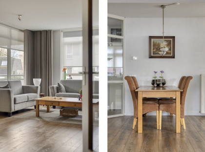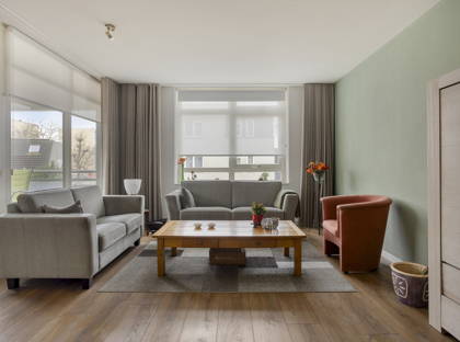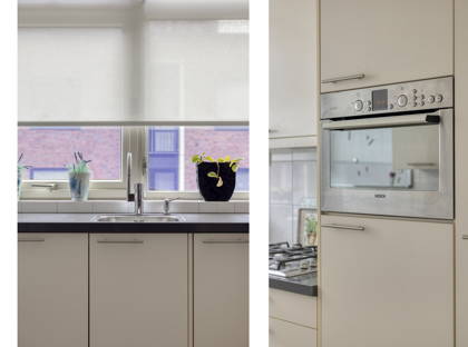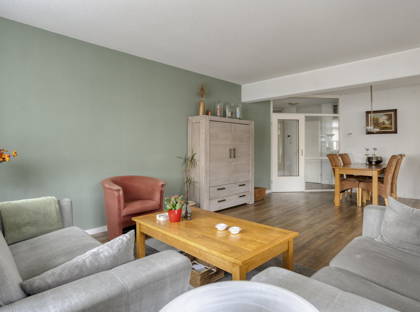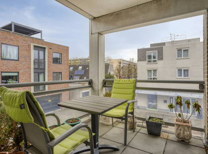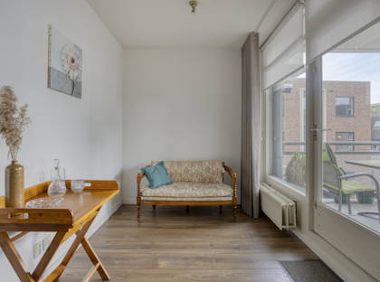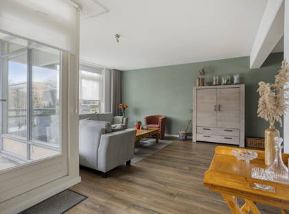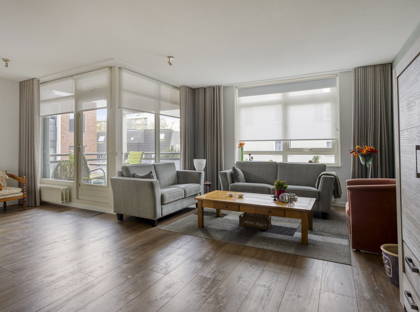 De woonkamer is ruim opgezet en profiteert dankzij de hoekligging van grote raampartijen aan twee zijden. Hierdoor is het hier de hele dag door aangenaam licht. Er is voldoende ruimte voor een gezellige zithoek én een eethoek. Vanuit de woonkamer stap je zo het balkon op: een fijne plek om ’s ochtends rustig wakker te worden met een kop koffie of aan het einde van de dag nog even buiten te zitten.