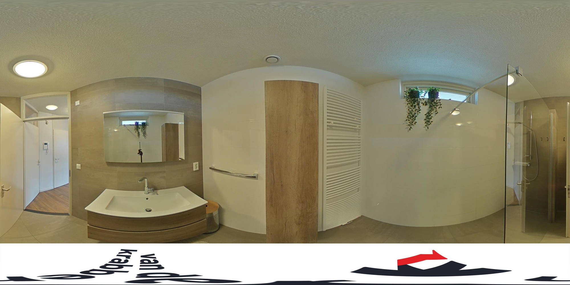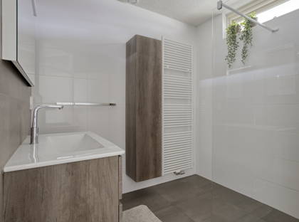 De badkamer is modern en verzorgd, met een inloopdouche, wastafelmeubel en designradiator. Het toilet is separaat. Daarnaast is er een inpandige berging met aansluitingen voor wasmachine en droger – altijd handig.
