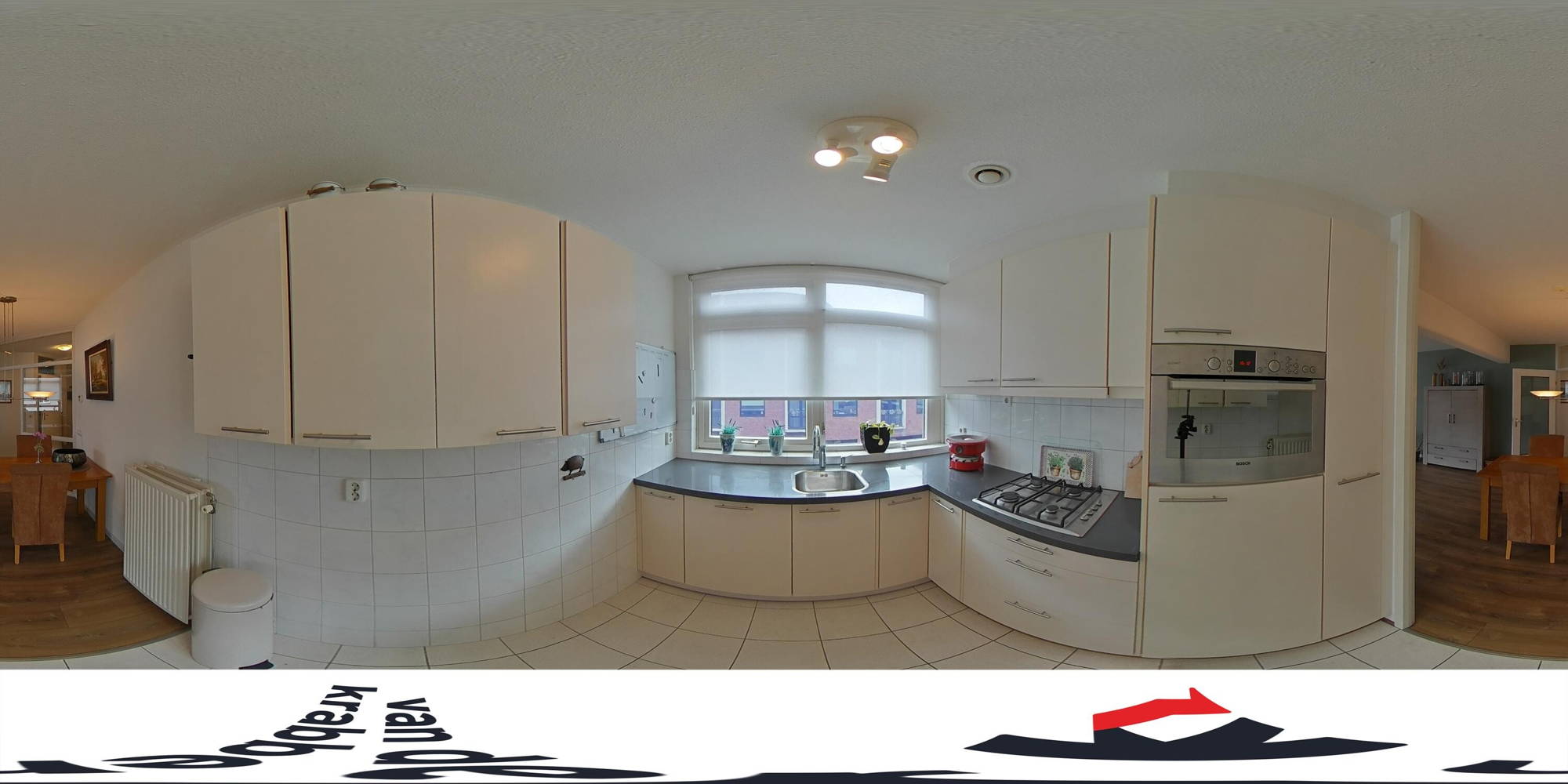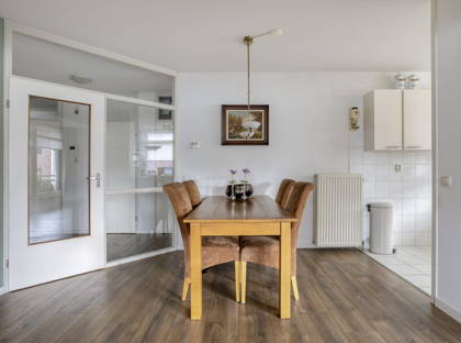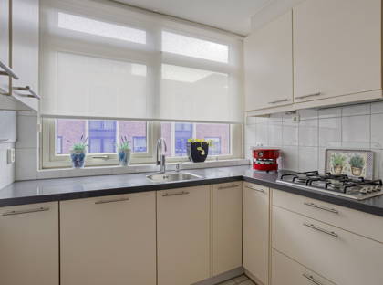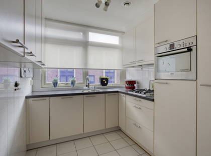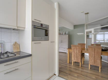 De keuken staat in open verbinding met de woonkamer en is uitgevoerd in een praktische L-opstelling. Deze is voorzien van diverse inbouwapparatuur en biedt meer dan genoeg kastruimte voor al je keukenspullen.