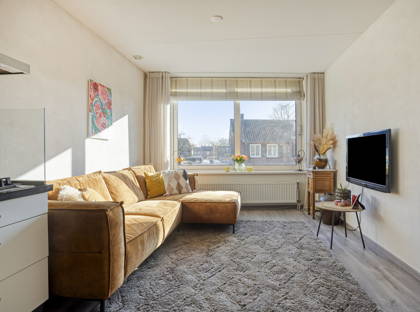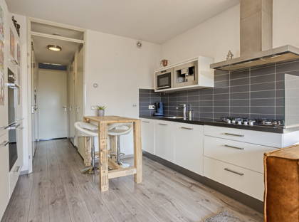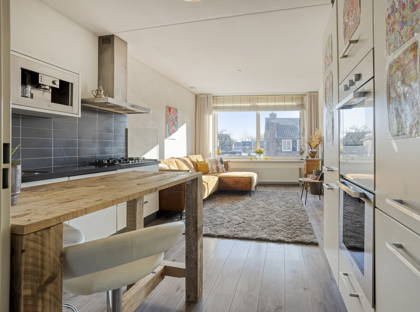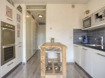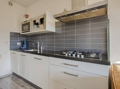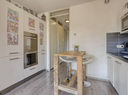 Aan de andere kant van het appartement ligt de open keuken en de woonkamer. Dankzij de slimme inrichting van de keuken is er veel praktische kastruimte én plek voor een kleine eettafel. Ondanks dat de keuken compact is, is deze zeer compleet ingericht met een 5-pits gasfornuis, afzuigkap, oven, wijnkoeler, een magnetron, een vaatwasser en een koelkast. In de woonkamer is ruimte voor een grote bank, om zo een knusse zithoek te creëren.