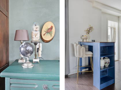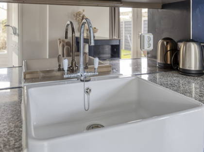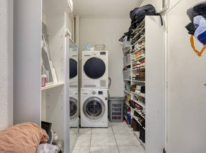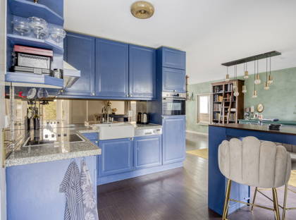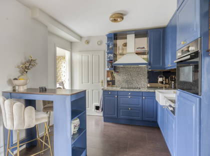 De open keuken is het ware middelpunt van het huis. Niet alleen vanwege de ligging, maar ook door de sprekende en sfeervolle blauwe kleur. De modern-landelijke kasten, de gootsteen in boerderijstijl en het natuurstenen aanrechtblad zijn stuk voor stuk eye catchers. De keuken is compleet uitgerust met een inductiekookplaat, afzuigkap, oven, koelkast en vaatwasser. Naast de keuken ligt nog een praktische bijkeuken: een ideale plek voor de wasmachine en de droger en om spullen op te bergen.