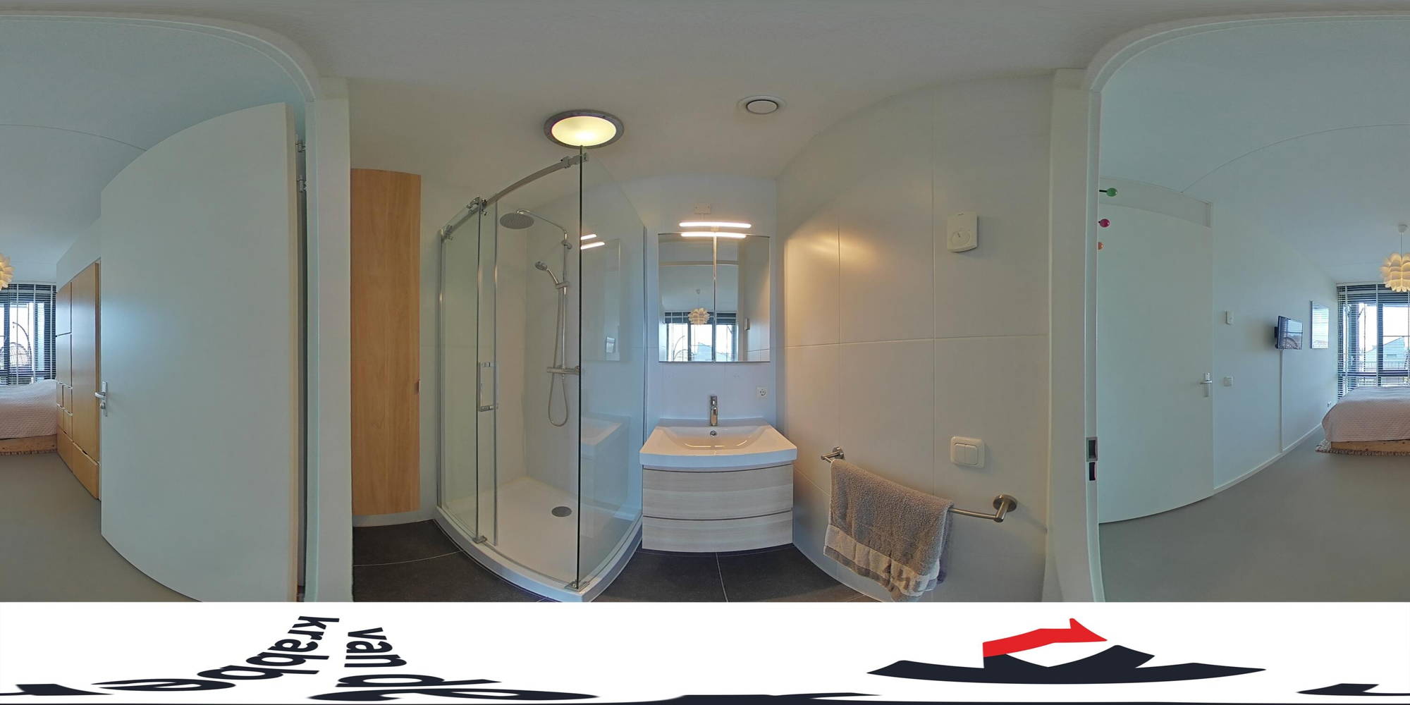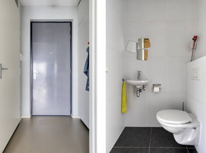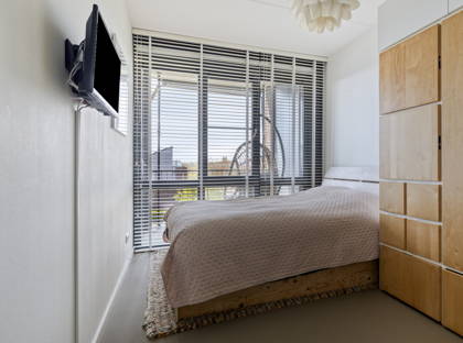 De slaapkamer is ruim genoeg voor een tweepersoonsbed en een kledingkast. De ensuite badkamer is voorzien van een douche en een wastafel. Daarnaast is er een aparte berging met witgoedaansluitingen en een separaat toilet.