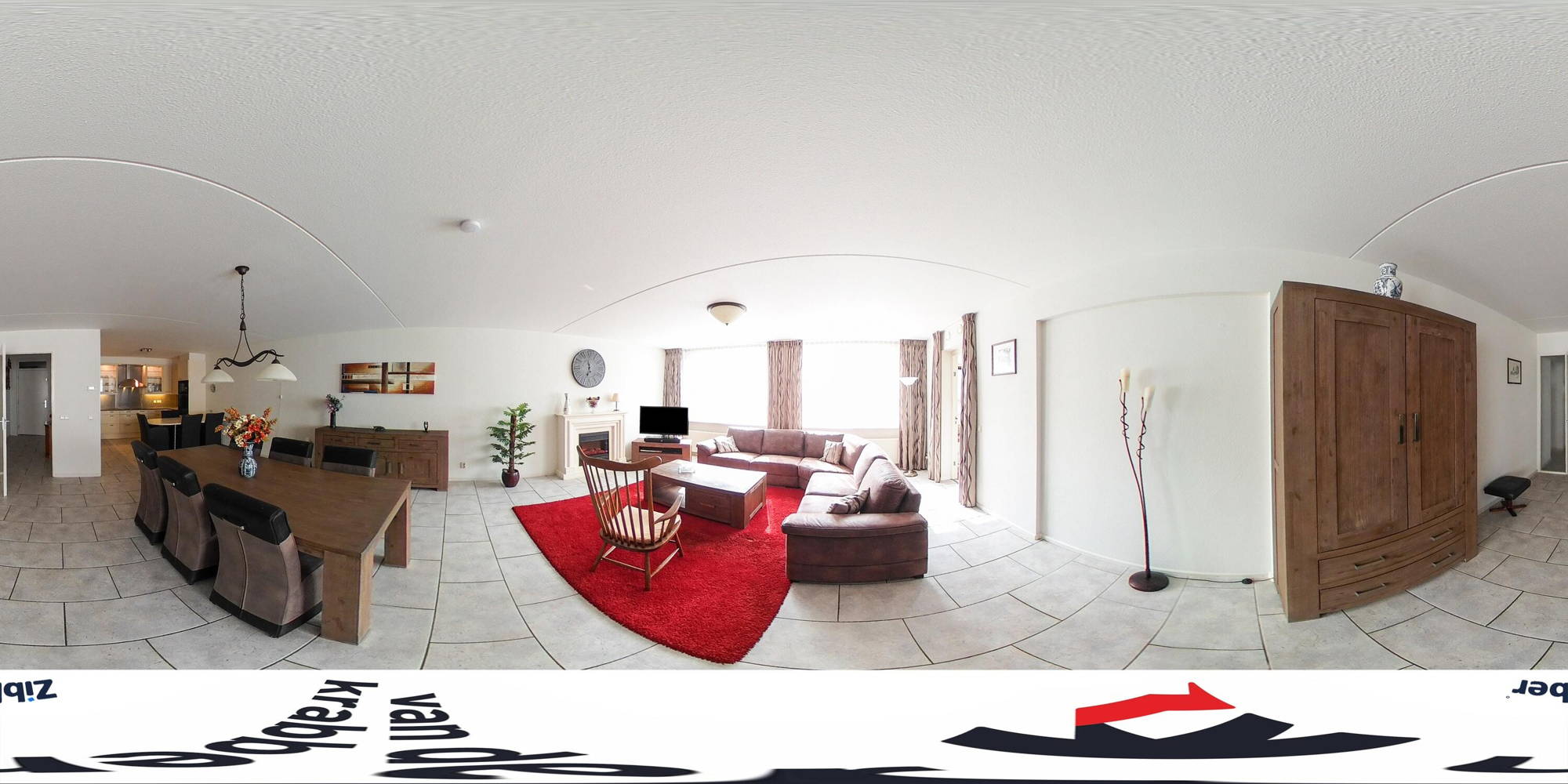- Een grote woonkamer met elektrische open haard en toegang tot de loggia