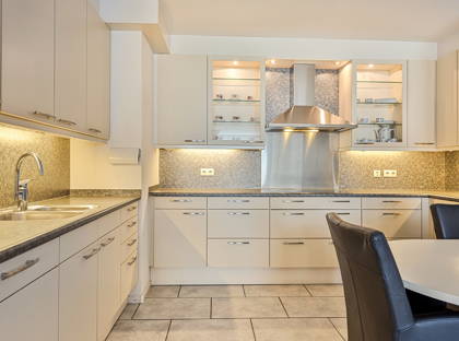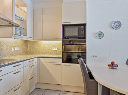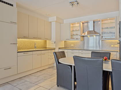 De keuken in U-opstelling is uitgerust met inbouwapparatuur zoals een inductiekookplaat, afzuigkap, magnetron, oven, koelkast, vriezer en vaatwasser.