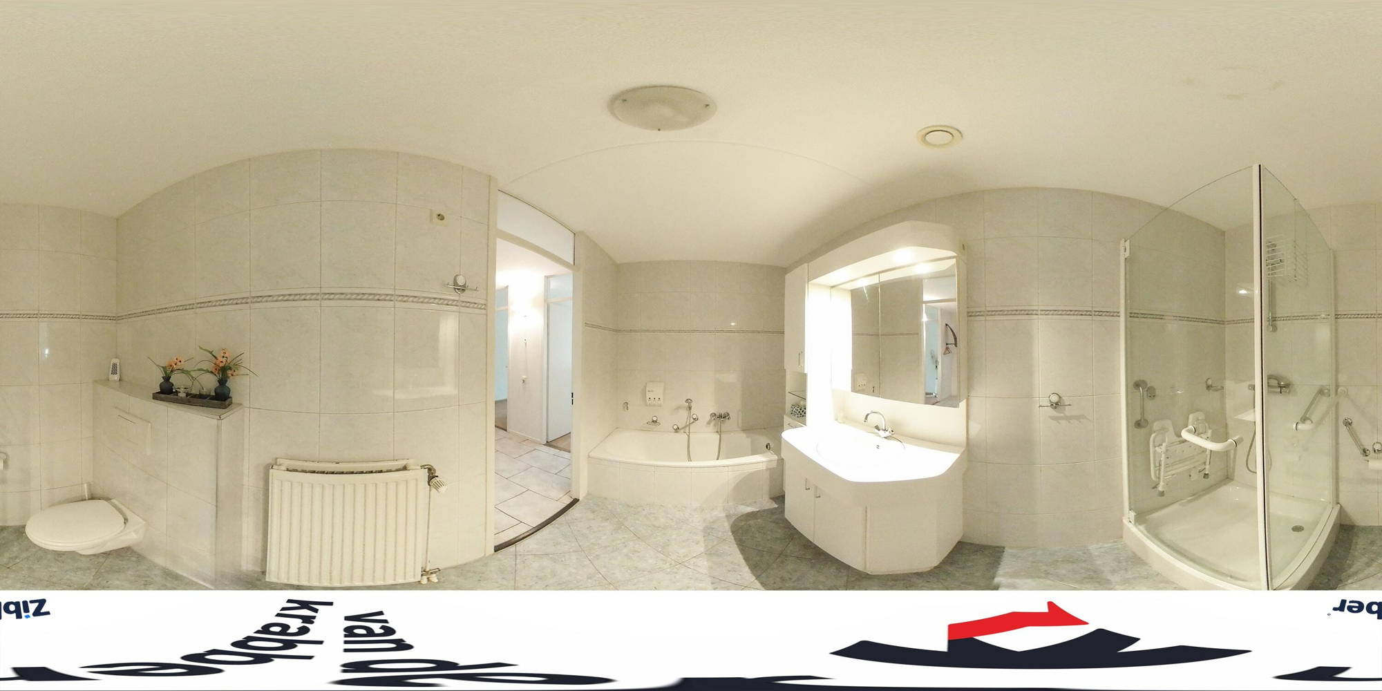 Een tweede hal leidt naar de slaapkamers, de toiletruimte met wandtoilet en fonteintje, de badkamer en een berging met witgoedaansluitingen en CV-ketel. De badkamer is uitgerust met een ligbad, wastafelmeubel, douchecabine en toilet.