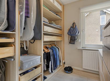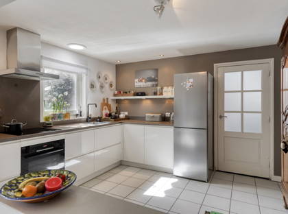 Door de jaren heen is de woning uitgebouwd, waardoor een royale en praktische leefruimte is ontstaan. In de ruime uitbouw bevindt zich de heerlijke woonkeuken. Aan de grote eettafel kun je hier met het hele gezin samenkomen. De moderne keuken heeft een praktische indeling en is voorzien van een inductiekookplaat, afzuigkap, oven, koel-vriescombinatie, vaatwasser en een plintboiler voor warm water. Zowel de keuken als de uitbouw zijn uitgerust met comfortabele vloerverwarming.
