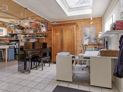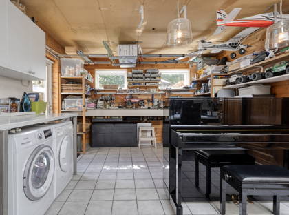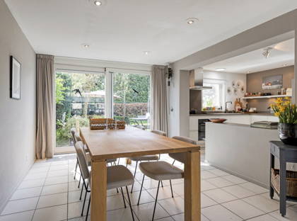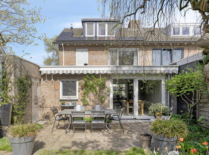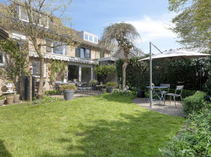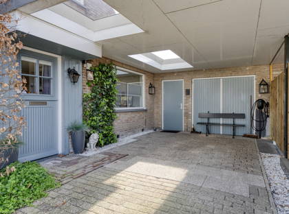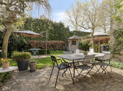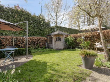 Vanuit de keuken heb je toegang tot de inpandige garage, die zeer ruim is en prettig licht dankzij de lichtkoepel. De schuifpui (2022) in de eetkamer geeft toegang tot de groene, speels aangelegde tuin met veel privacy. Er zijn meerdere terrassen aangelegd, waardoor je altijd een fijn plekje vindt om van de zon te genieten. De tuin is rijk aan volwassen beplanting en vormt een echte oase van groen. Achterin staat een praktisch tuinhuis.