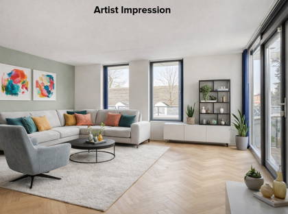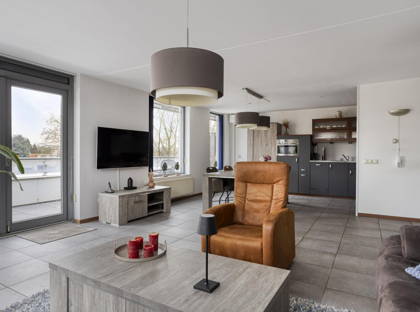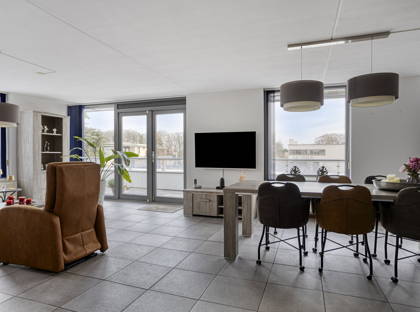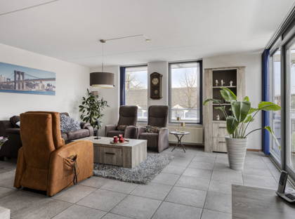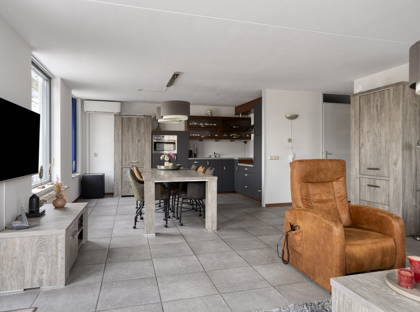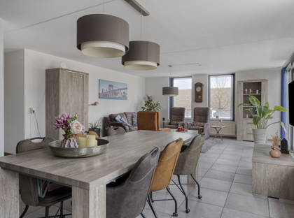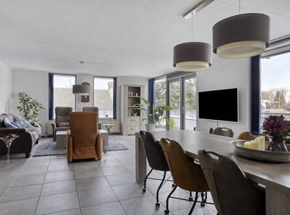 Zodra je binnenkomt, merk je het al: dit appartement voelt open, licht en comfortabel. Vanuit de hal heb je toegang tot alle vertrekken. De woonkamer is royaal opgezet en wordt dankzij de vele raampartijen prachtig verlicht. Hier kijk je vrij weg en geniet je van een fijne, open sfeer. Op warme dagen zorgt de airco voor extra comfort, wel zo prettig in een penthouse.