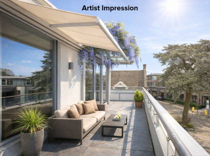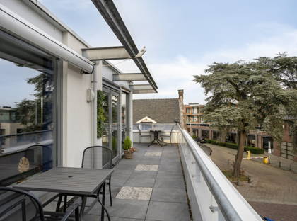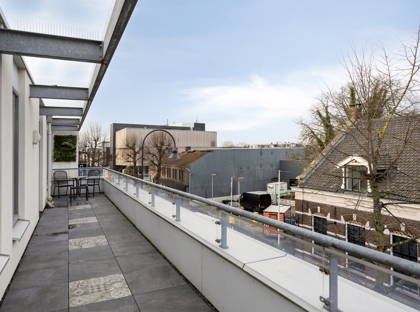 Een van de absolute pluspunten is het grote dakterras rondom de woning. Dankzij de ligging heb je hier altijd wel een zonnig of juist schaduwrijk plekje, mede door het aanwezige zonnescherm. Een fijne buitenruimte waar je echt tot rust komt, terwijl de levendigheid van het centrum nooit ver weg is.