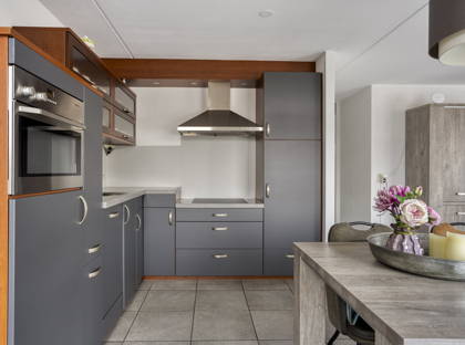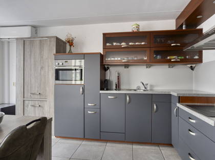 De open keuken sluit naadloos aan op de woonkamer en vormt een gezellige plek om te koken terwijl je contact houdt met je gezelschap. De keuken is praktisch ingericht en de kastjes werden in 2025 opnieuw bekleed, waardoor deze weer een frisse, eigentijdse uitstraling hebben.