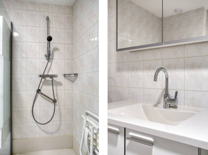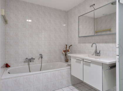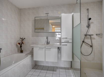 De badkamer is netjes en voorzien van een comfortabele inloopdouche, wastafelmeubel en ruim ligbad. Daarnaast is er een apart toilet, wat prettig is voor het ontvangen van gasten.