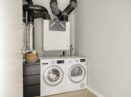 Wat dit huis écht bijzonder maakt, is de volwaardige tweede verdieping. Via een vaste trap kom je op een overloop met nog eens drie (slaap)kamers en een aparte technische ruimte met aansluitingen voor wasmachine en droger. Ruimte voor een groot gezin, een logeerkamer, een thuiskantoor en een hobbykamer; of alles tegelijk. Net als de rest van het huis is ook deze verdieping tot in de puntjes afgewerkt; je hoeft alleen je spullen nog neer te zetten.