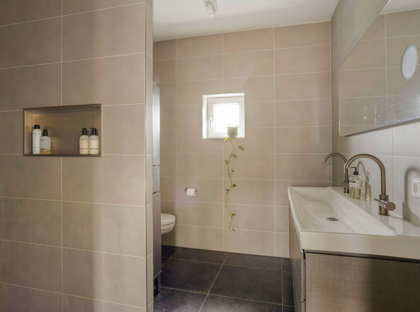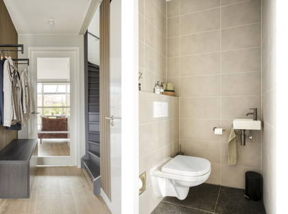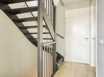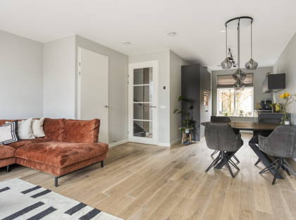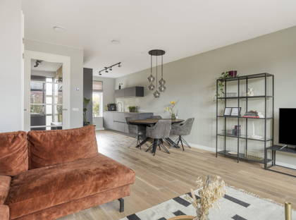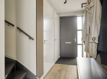 Bij binnenkomst in de woning valt direct de moderne en hoogwaardige afwerking op. Dit huis is nog maar een paar jaar oud en dat zie je! Vanuit de hal, met modern toilet, heb je toegang tot de woonkamer. De karakteristieke houten vloer die je hier ziet, ligt op de hele benedenverdieping en geeft het geheel een warme en sfeervolle uitstraling. De gehele woning is voorzien van zowel vloerverwarming als vloerverkoeling, wat zorgt voor een aangenaam binnenklimaat in ieder seizoen.