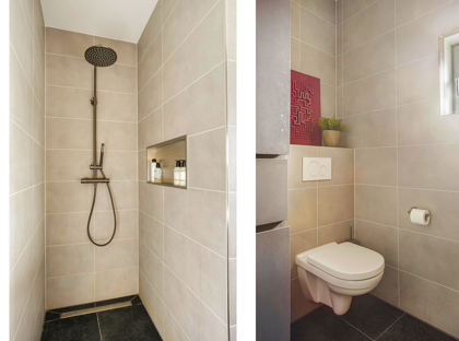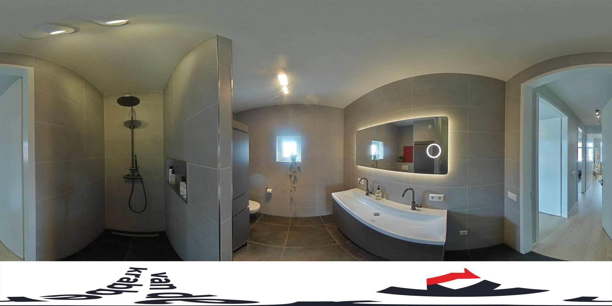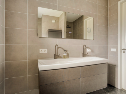 Op de overloop kom je drie ruime en lichte slaapkamers tegen, plus een moderne badkamer met dubbele wastafel in meubel, ruime inloopregendouche en tweede toilet. Een verdieping waar het hele gezin met gemak terechtkan.