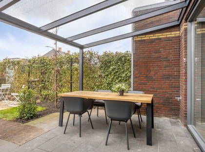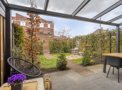 Aangekomen in de tuin bevind je je eerst onder de ruime overkapping. Deze is zo groot dat je er met het hele gezin onder kunt genieten, het hele jaar door. Dankzij het glazen dak van de overkapping, blijft het ook in de woonkamer lekker licht. De tuin is professioneel aangelegd met meerdere zitjes, gras, planten, bomen en struiken. Dankzij de sproei-installatie is de tuin makkelijk te onderhouden, ook in de zomer. Achter in de tuin is nog een ruime berging voor fietsen en tuinspullen, deze is ook voorzien van elektriciteit.